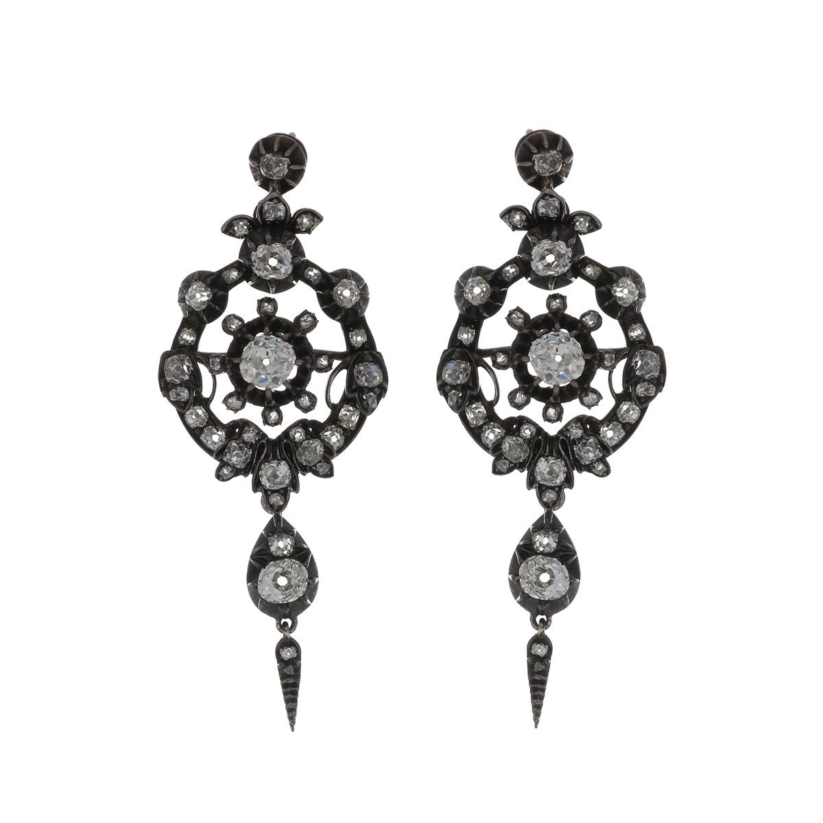 An antique classic mid-Victorian silver topped 14K yellow gold diamond drop wreath earrings. Circa 1860