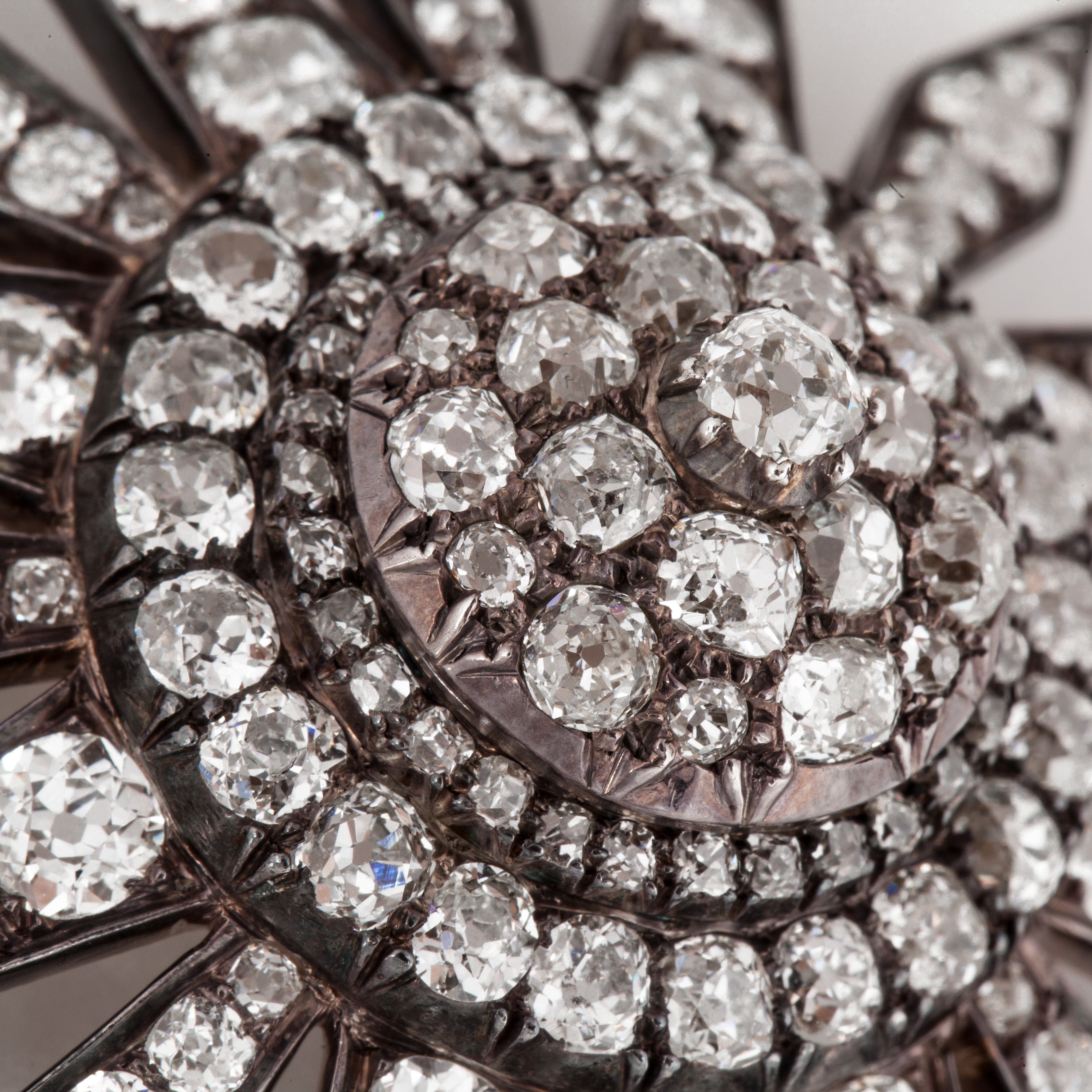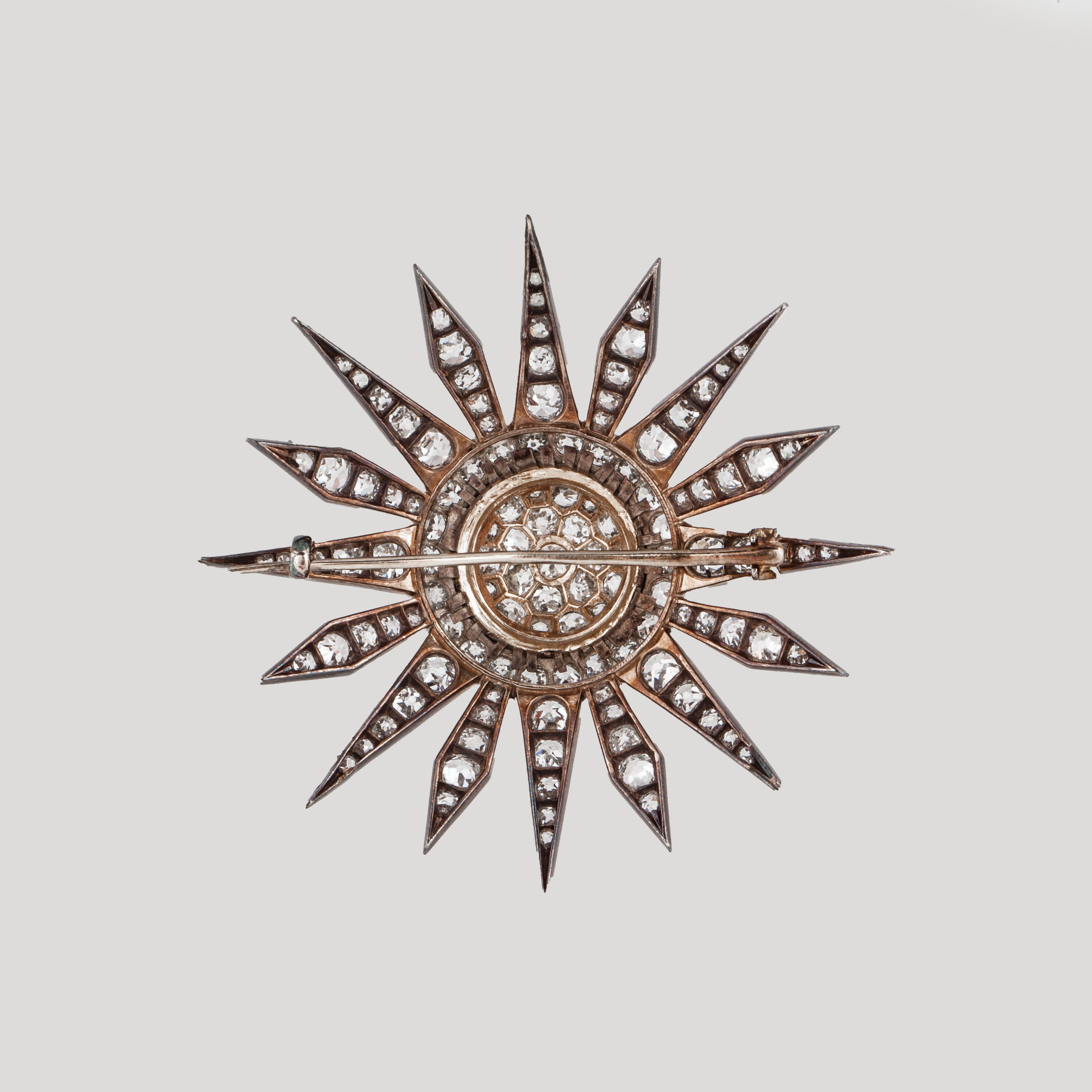A Victorian diamond starburst brooch with a rubbed-over setting in 18K yellow gold and sterling silver. Russia, circa 1860.
