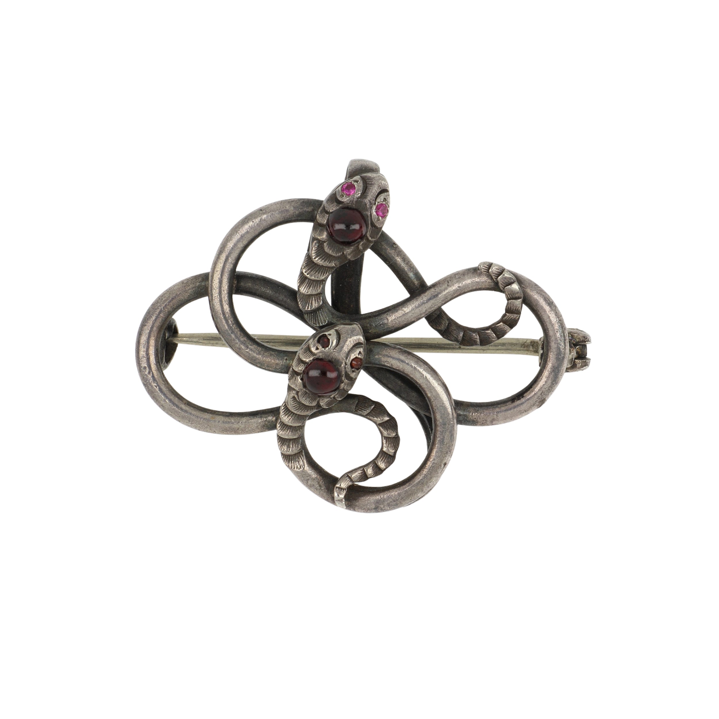 A Victorian serpent pin with garnets set in sterling silver. Circa 1850.