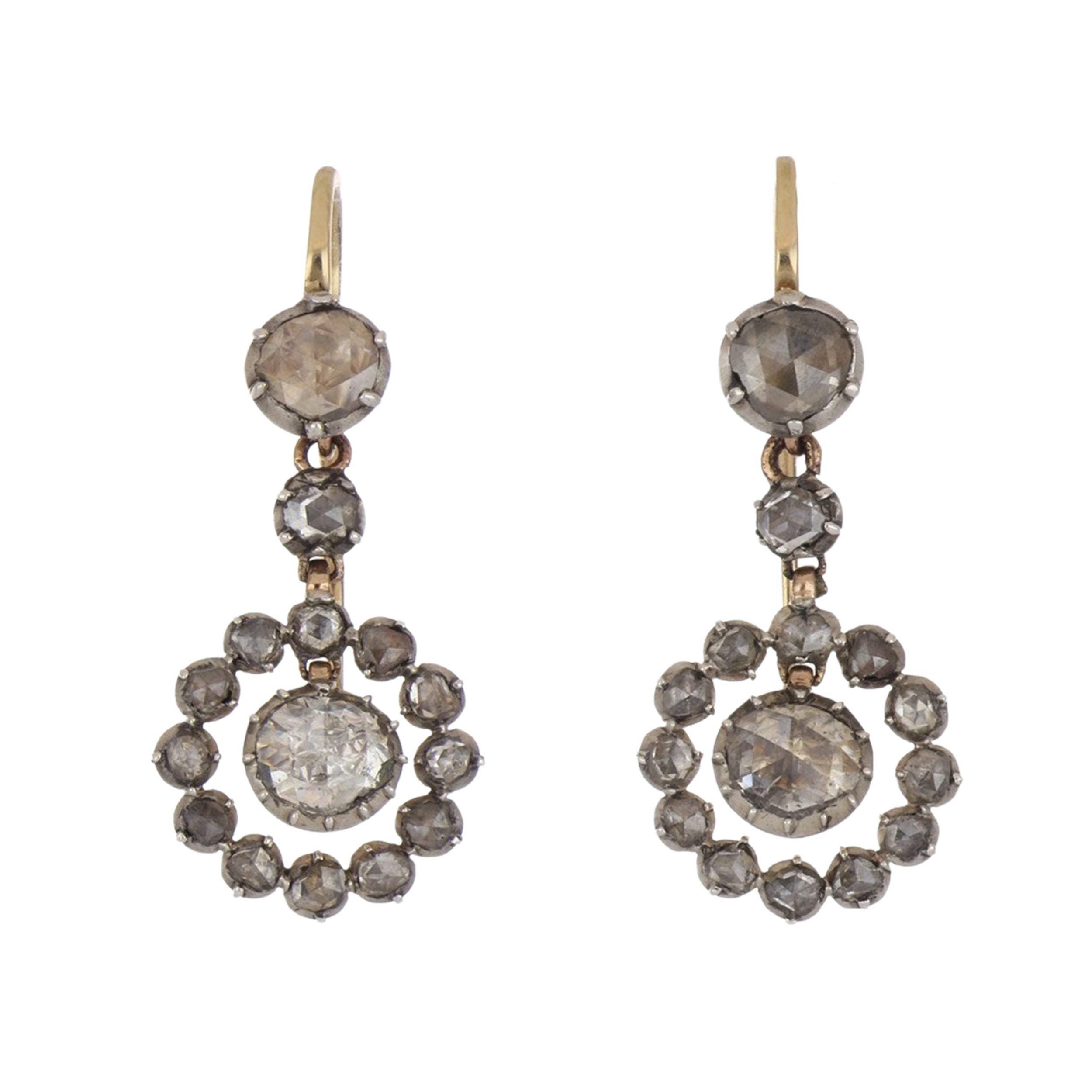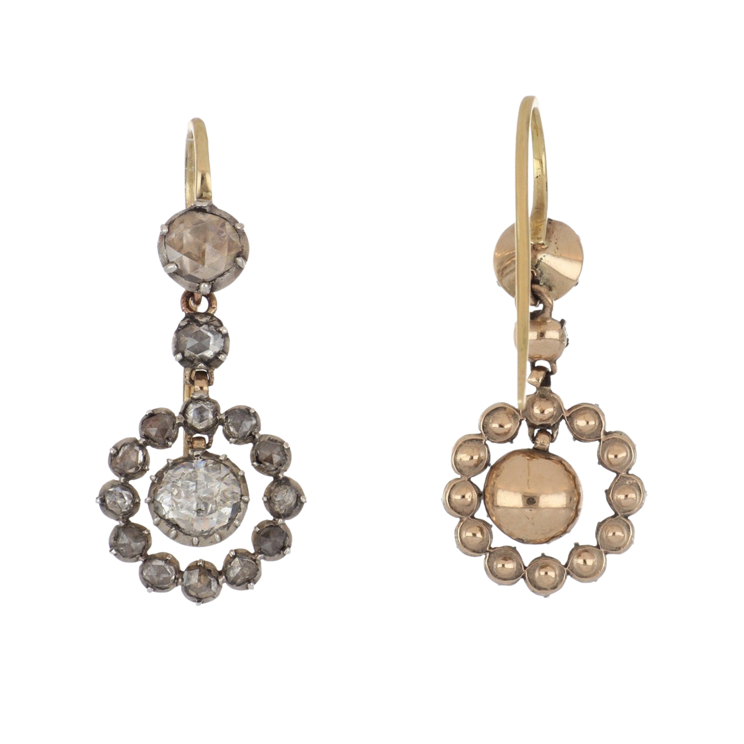 A pair of Victorian 18K yellow gold & sterling silver rose-cut diamond cluster drop earrings. Circa 1860.