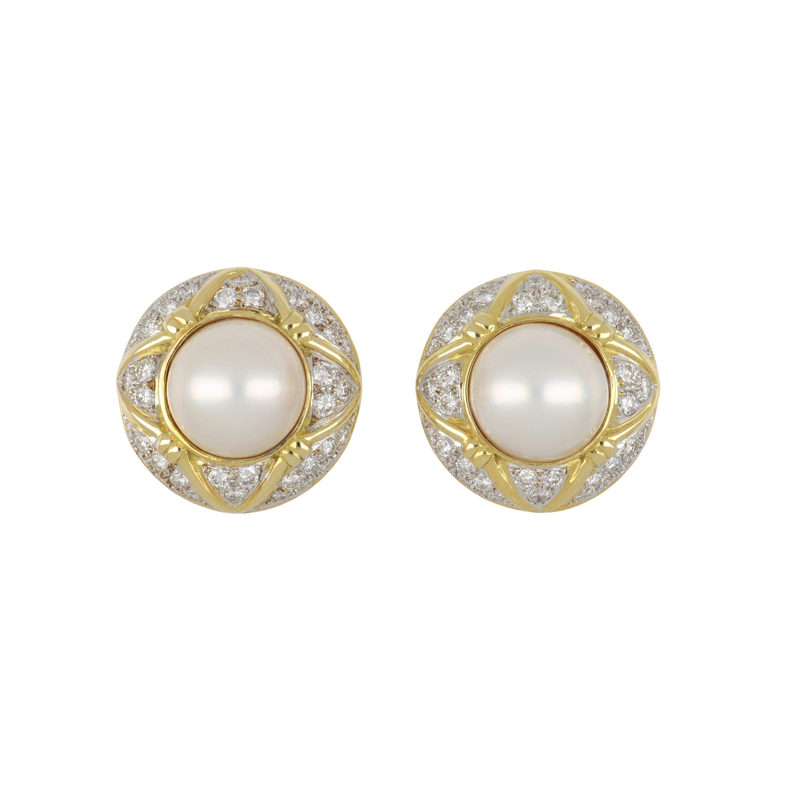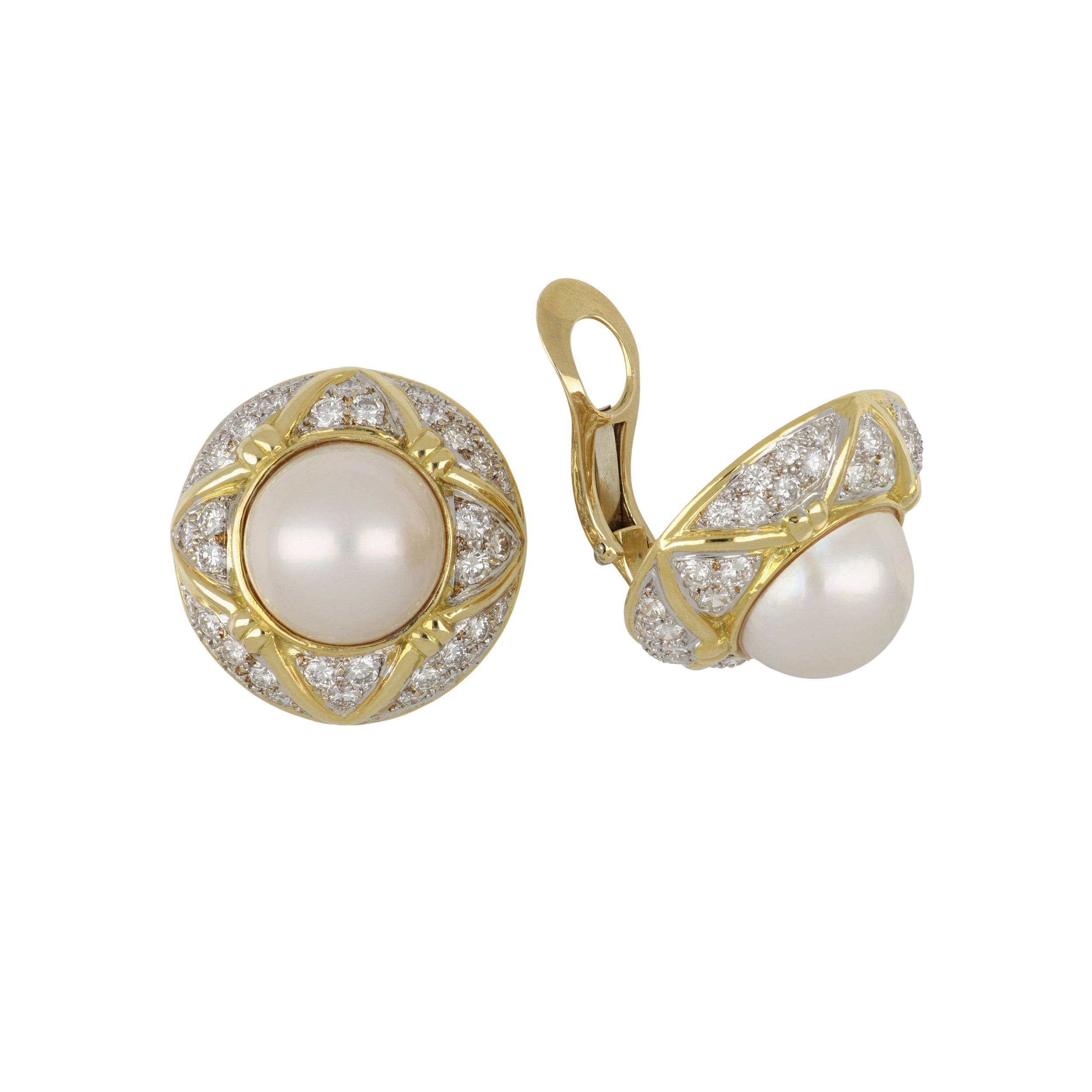 A vintage pair of 18K yellow gold oversized mabe pearl earrings with a diamond border. Circa 1980.
