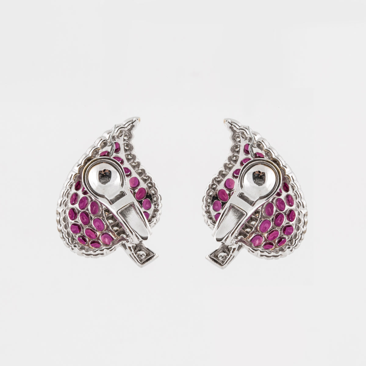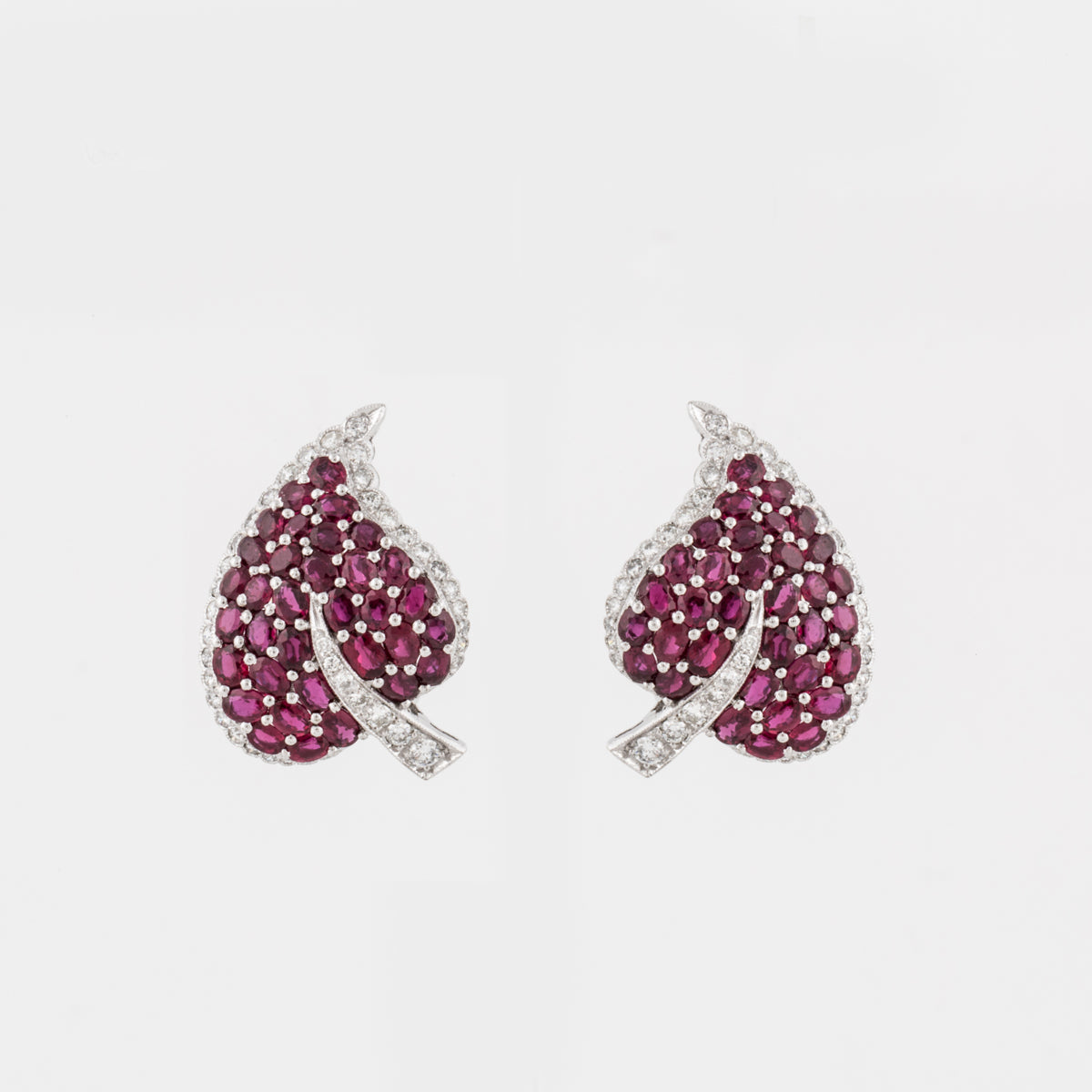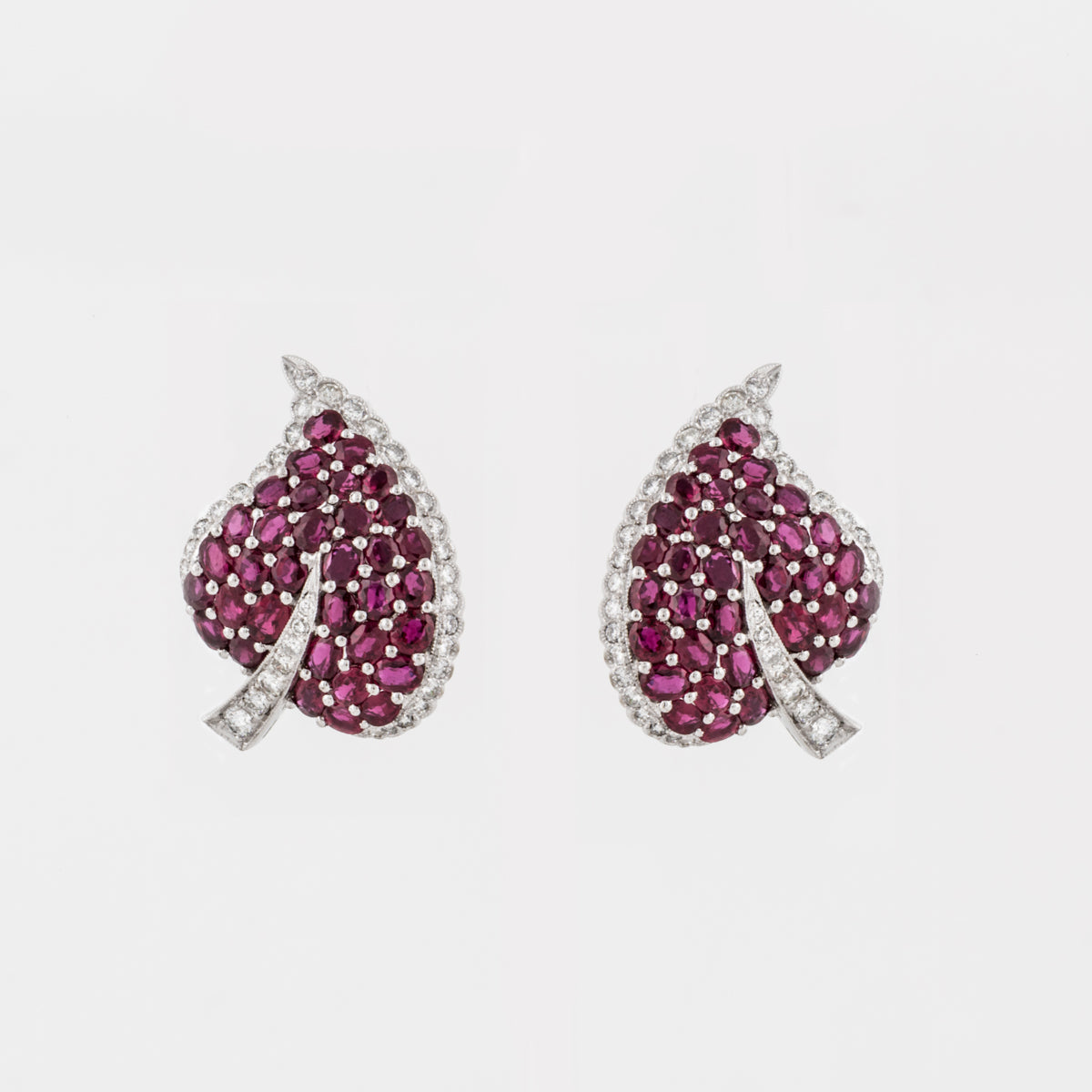 An estate oval ruby and round brilliant cut diamond leaf earrings, set in 18K white gold with 14K white gold backs. Circa 2000
