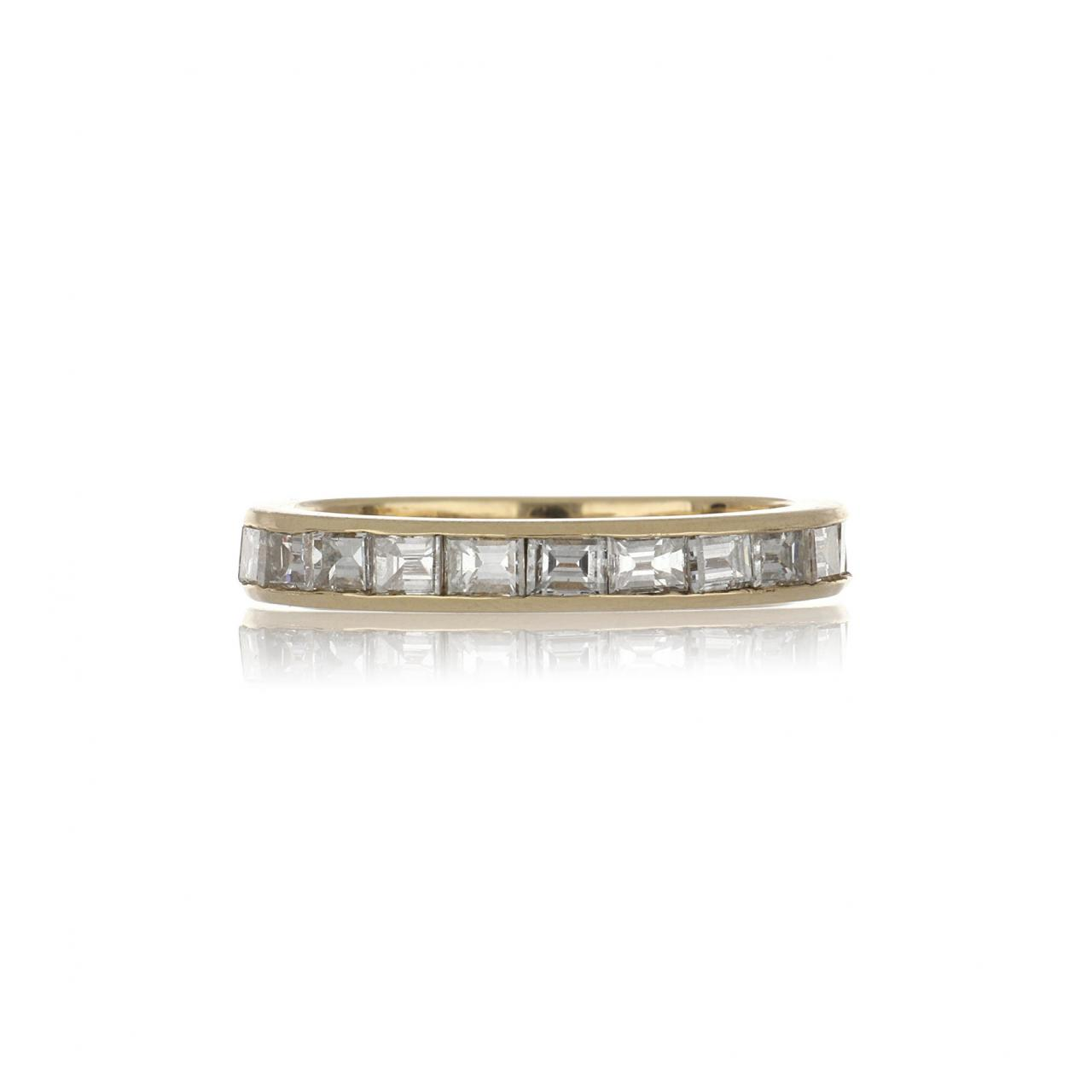 An estate modern, channel-set east-west, baguette-cut diamond eternity band set in 14k yellow gold.