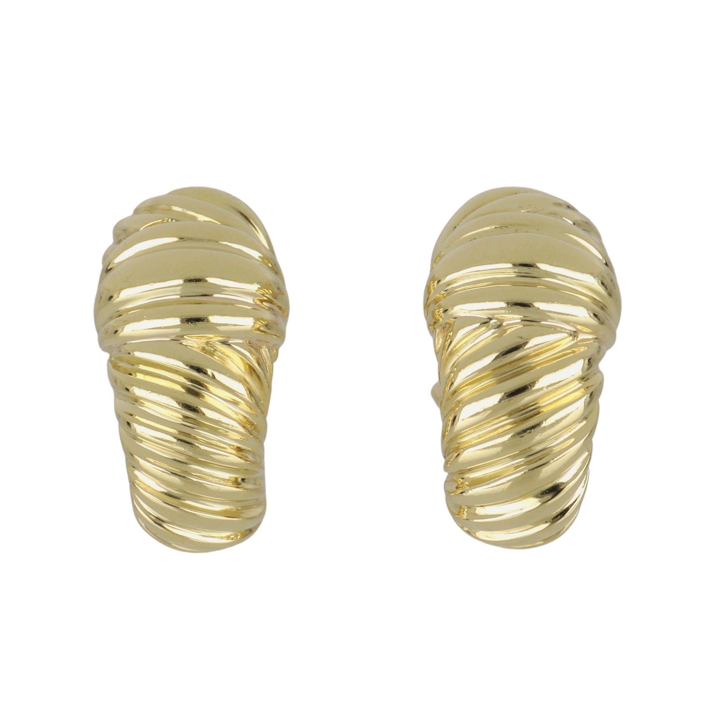 A pair of estate modern, David Yurman shrimp hoop earrings set in 18k yellow gold. Circa 2000.