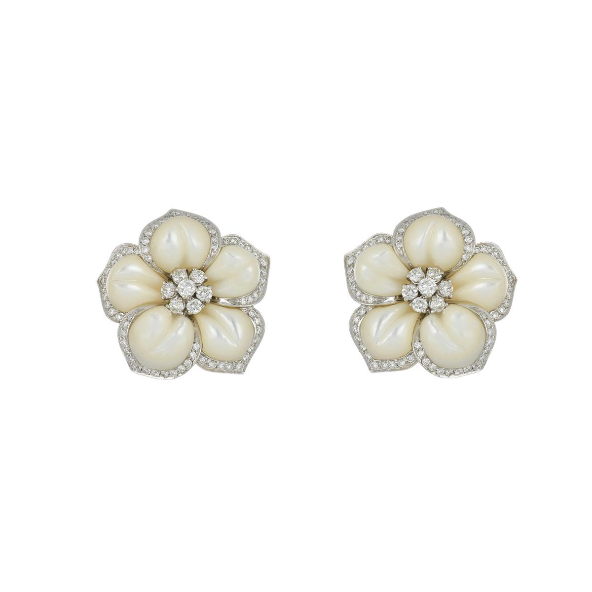 A pair of estate modern, Ambrosi carved mother of pearl and round diamond floral clip earrings set in 18k white gold. Italy, Circa 2000.