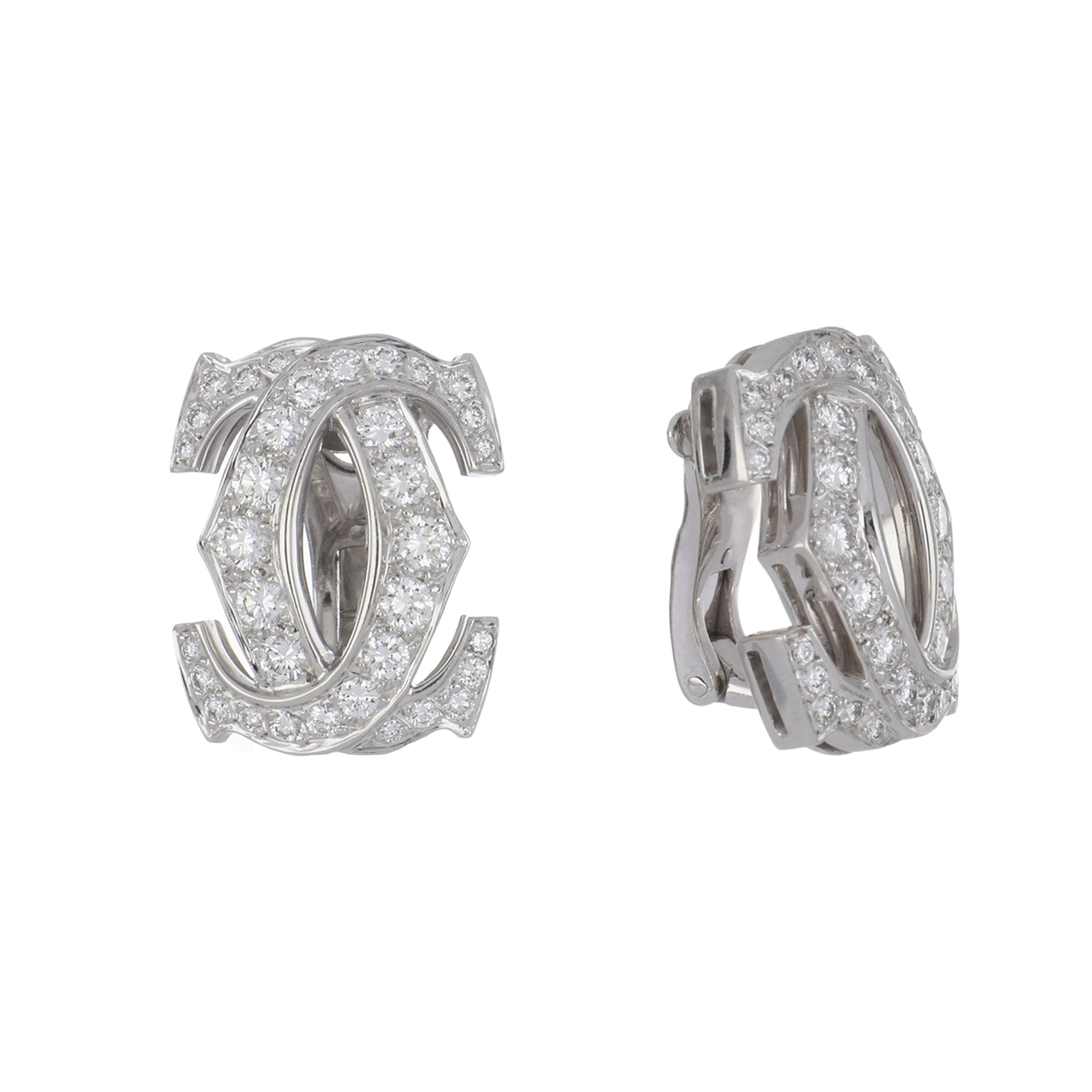 An estate Cartier pave round brilliant-cut diamond Double C seven row panther link collar necklace with a pair of Double C motif pave round brilliant-cut diamond earrings. Accompanied with Cartier boxes. France, circa 2000.