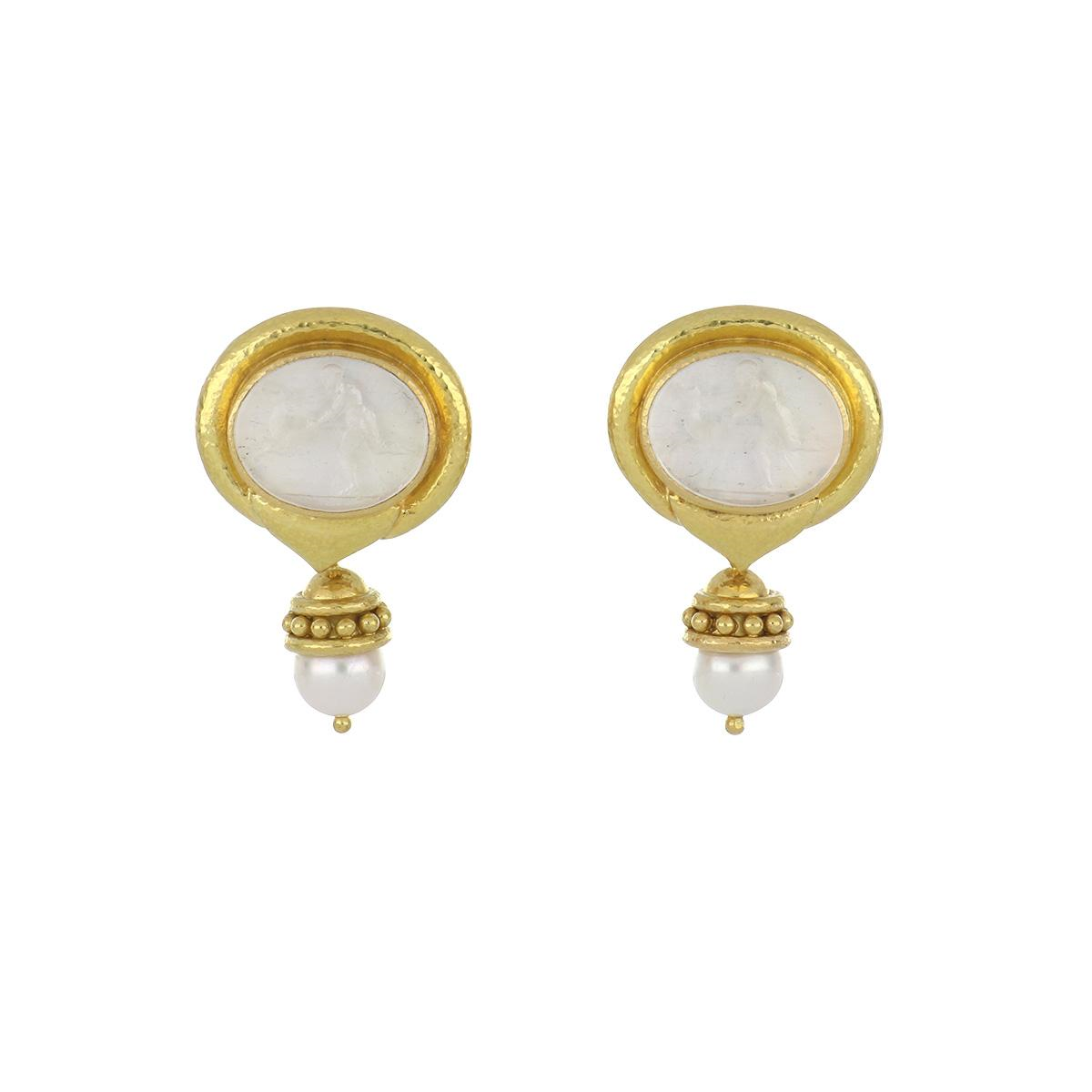 A pair of estate classic modern Elizabeth Locke, day/night earrings with white venetian glass itaglio and drilled round pearl drops in 18k yellow gold.