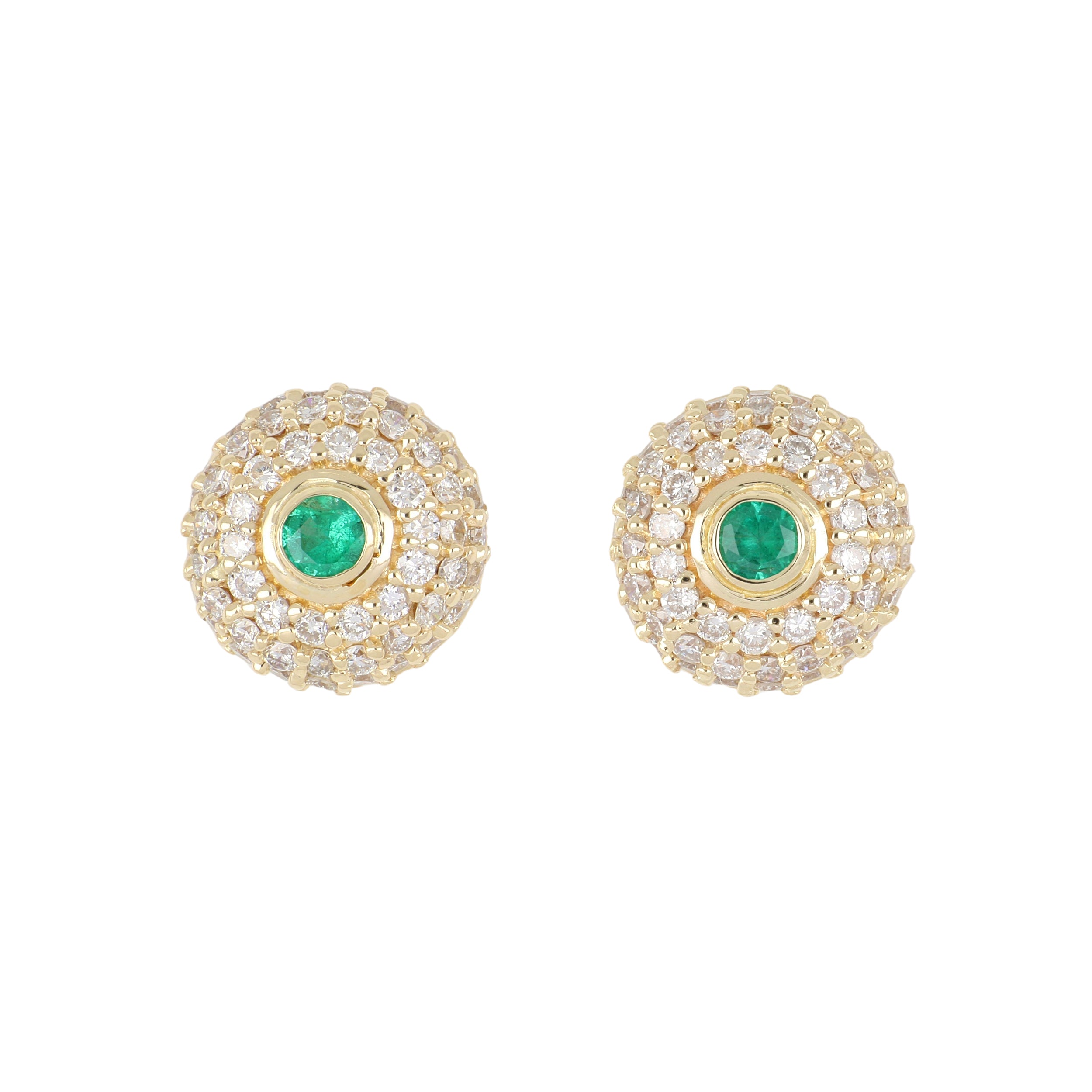 A pair of estate round brilliant-cut diamond and round emerald button earrings, set in 14K yellow gold . Circa 2000.