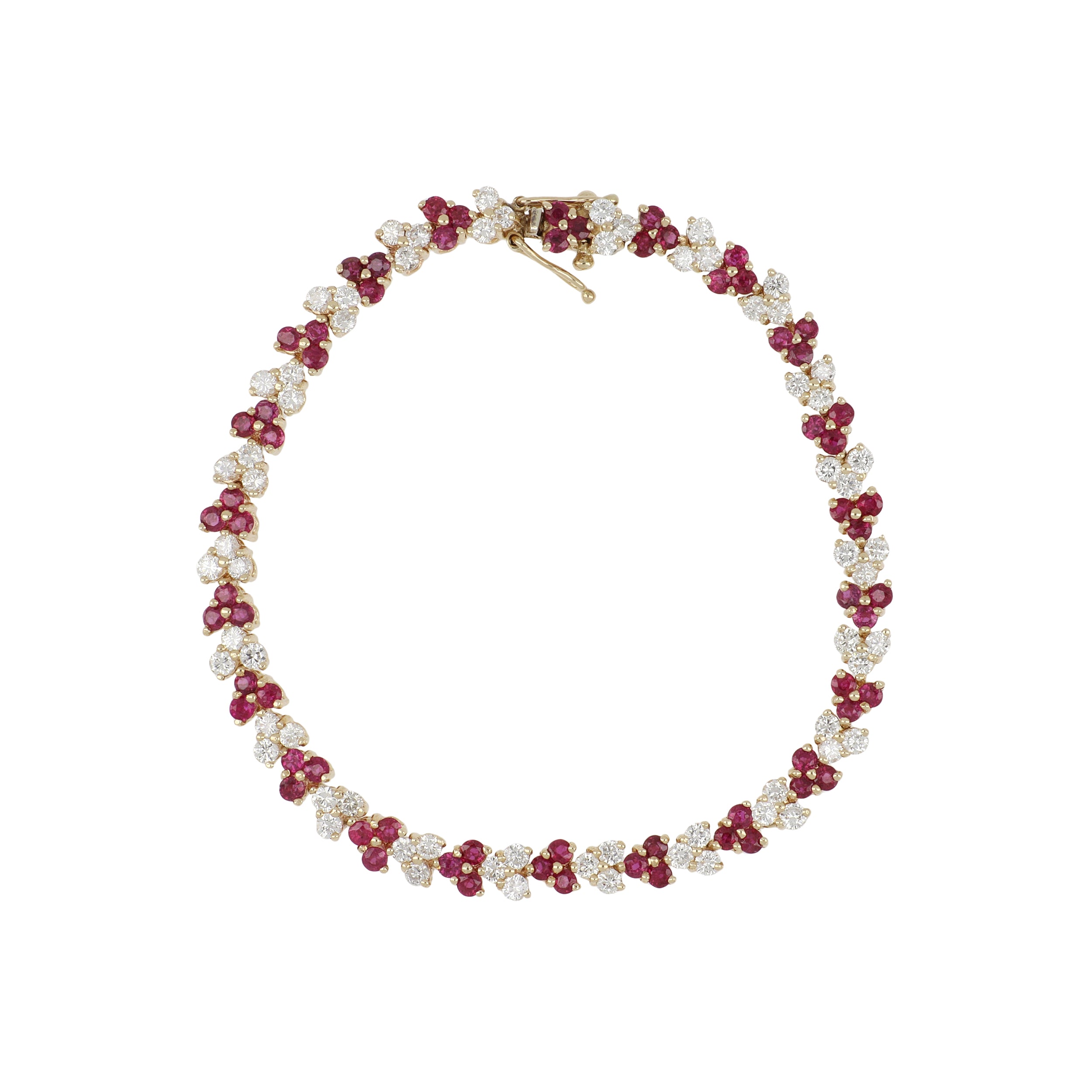 An estate alternating round cut ruby and round brilliant-cut diamond trefoil link bracelet, set in 14K yellow gold. Circa 2010.
