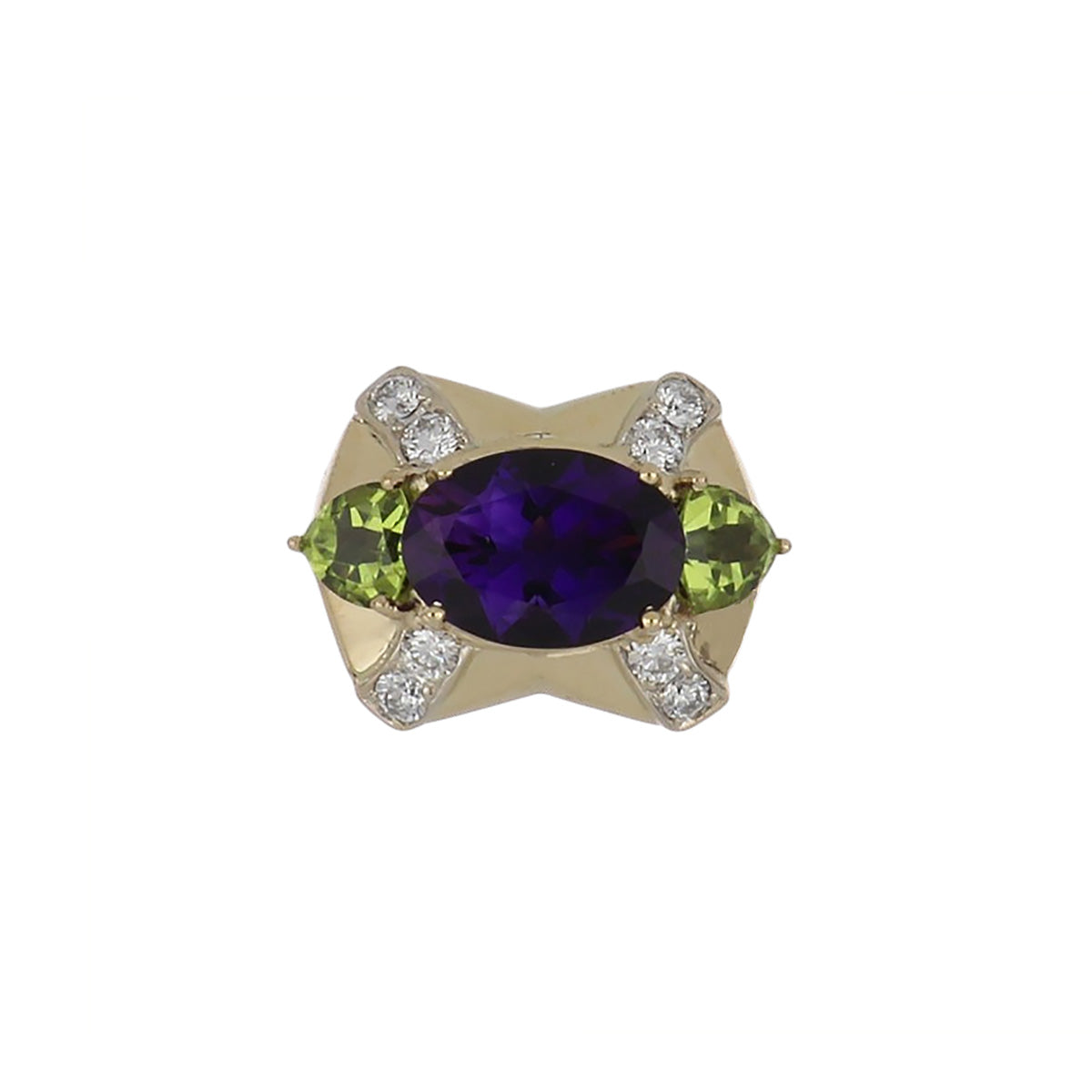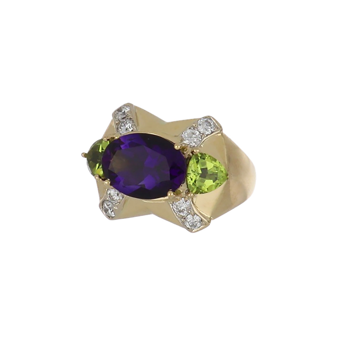 An 18K yellow gold amethyst and peridot ring with diamonds.