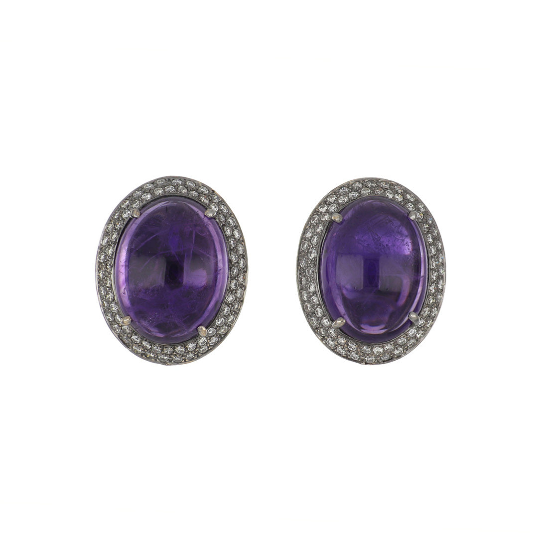 A pair of estate oval cabochon cut amethyst and round diamond button earrings, set in 18K white gold. Circa 2000.