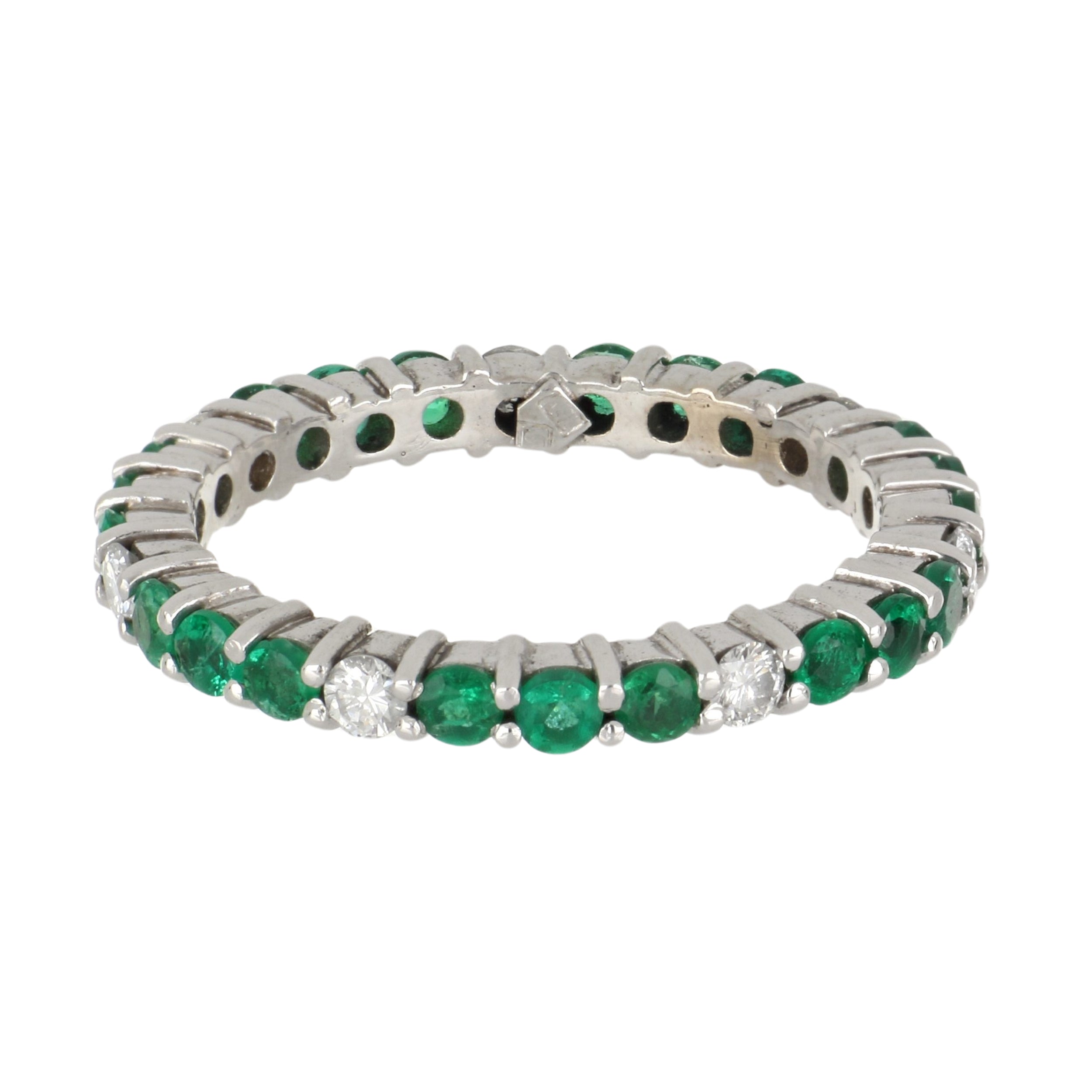 An estate, prong-set round emerald and round brilliant-cut diamond eternity band, set in 18K white gold. Circa 2010.