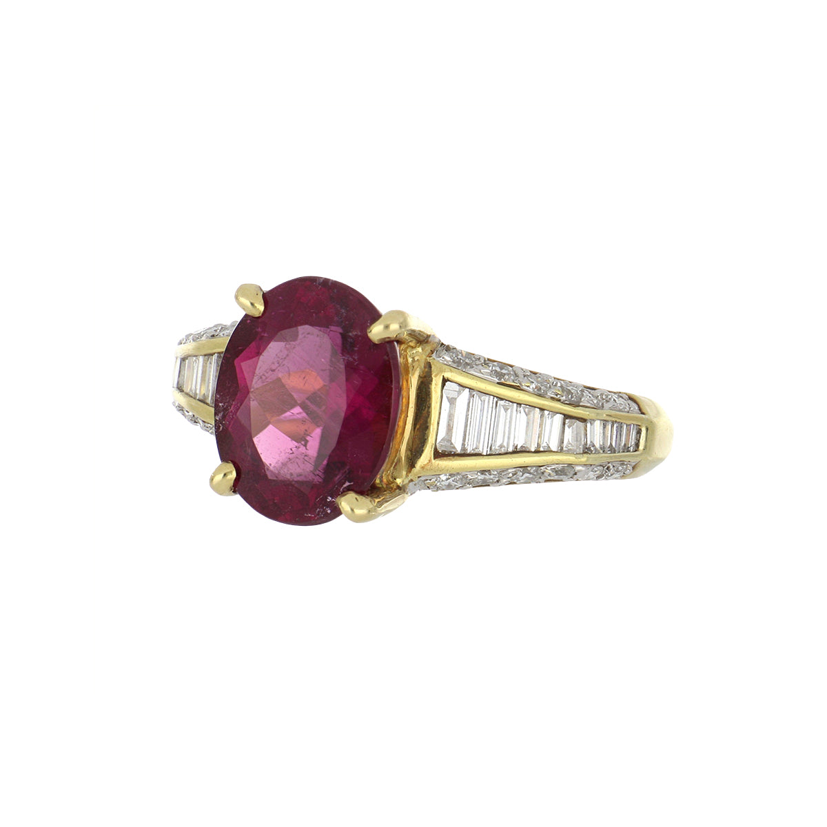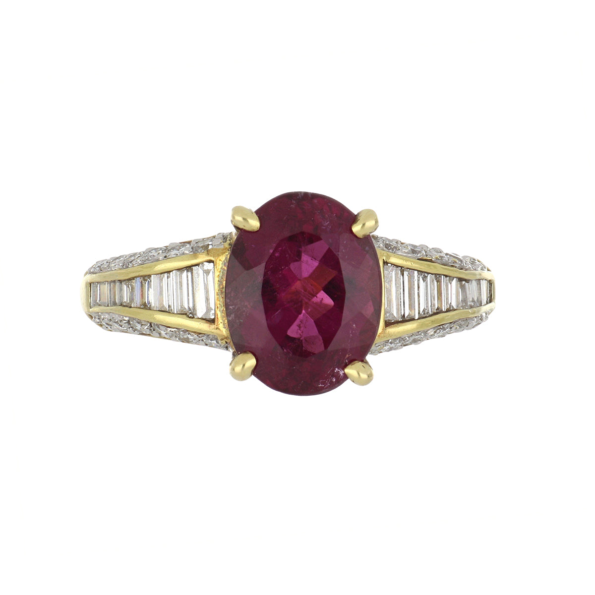 An estate oval-cut rubellite tourmaline ring with channel-set diamonds, set in 18K gold. Circa 2010.