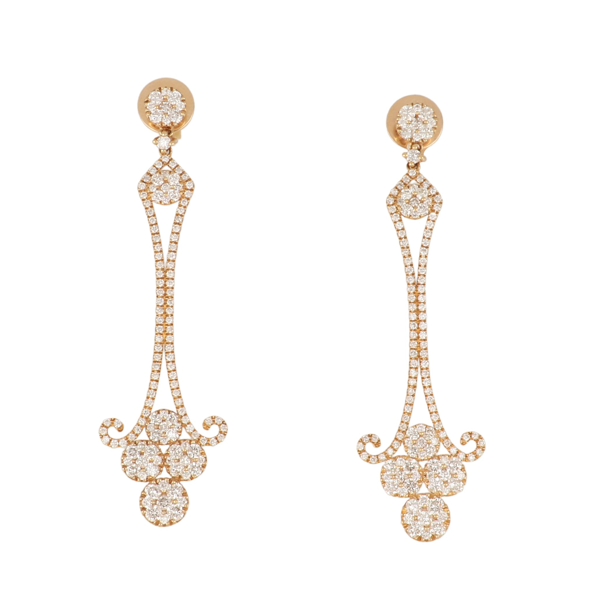 A pair of 18K rose gold diamond drop earrings.