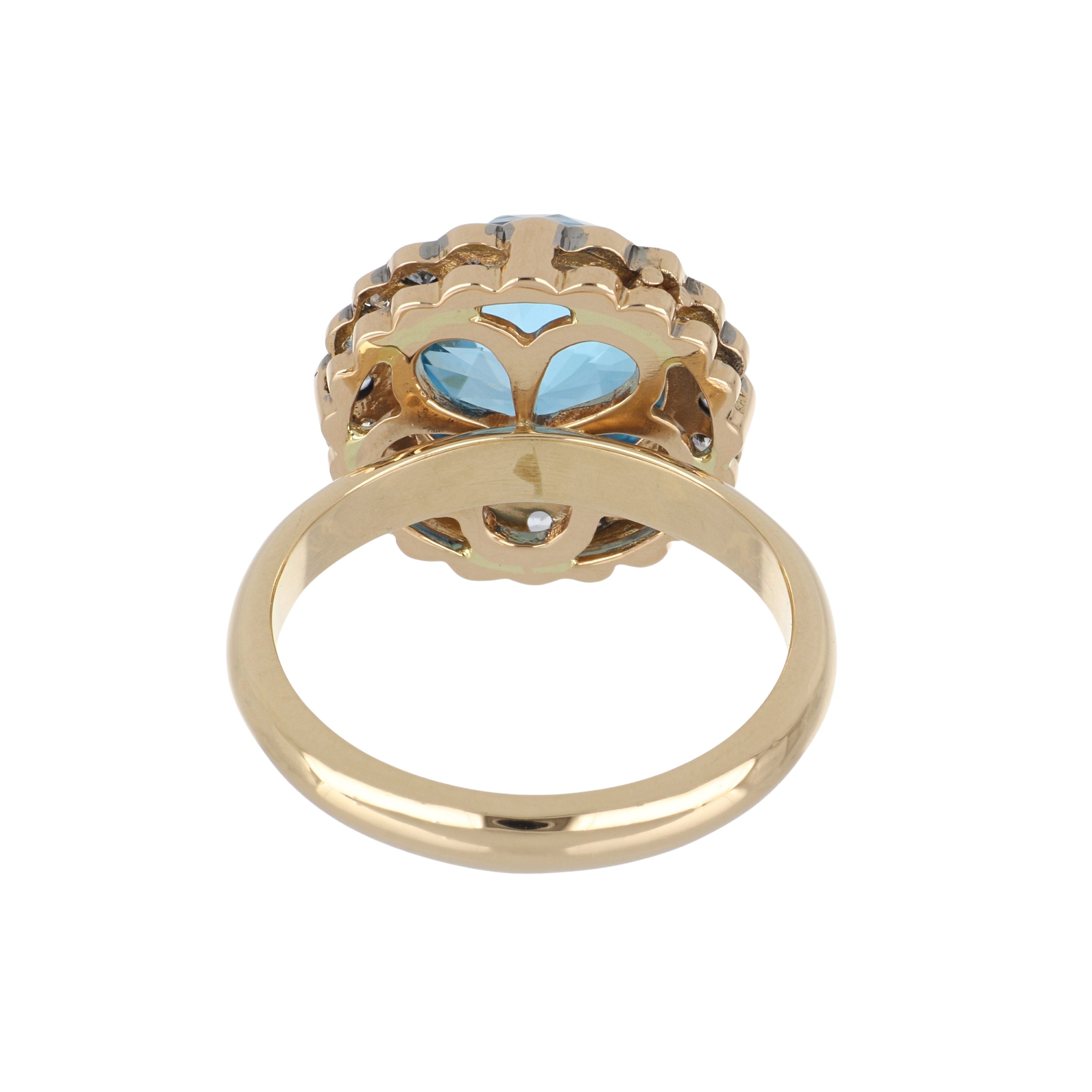 An estate rose-cut London blue topaz with a round-cut sapphire and round brilliant-cut diamond halo ring, set in 18K rose gold. Circa 2000.
