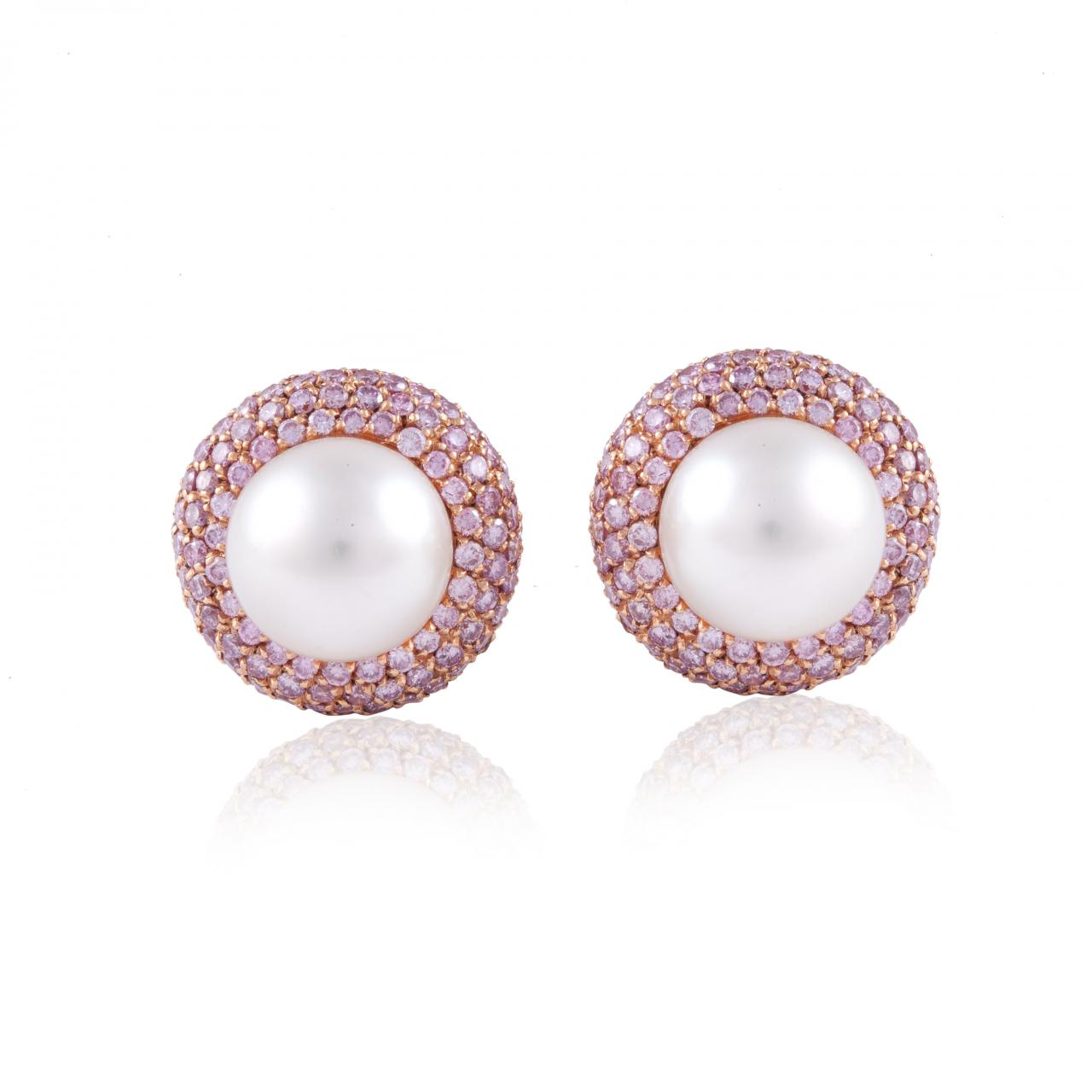 A pair of estate south sea pearl and fancy pink diamond button earrings, set in 18k rose gold. Circa 2000