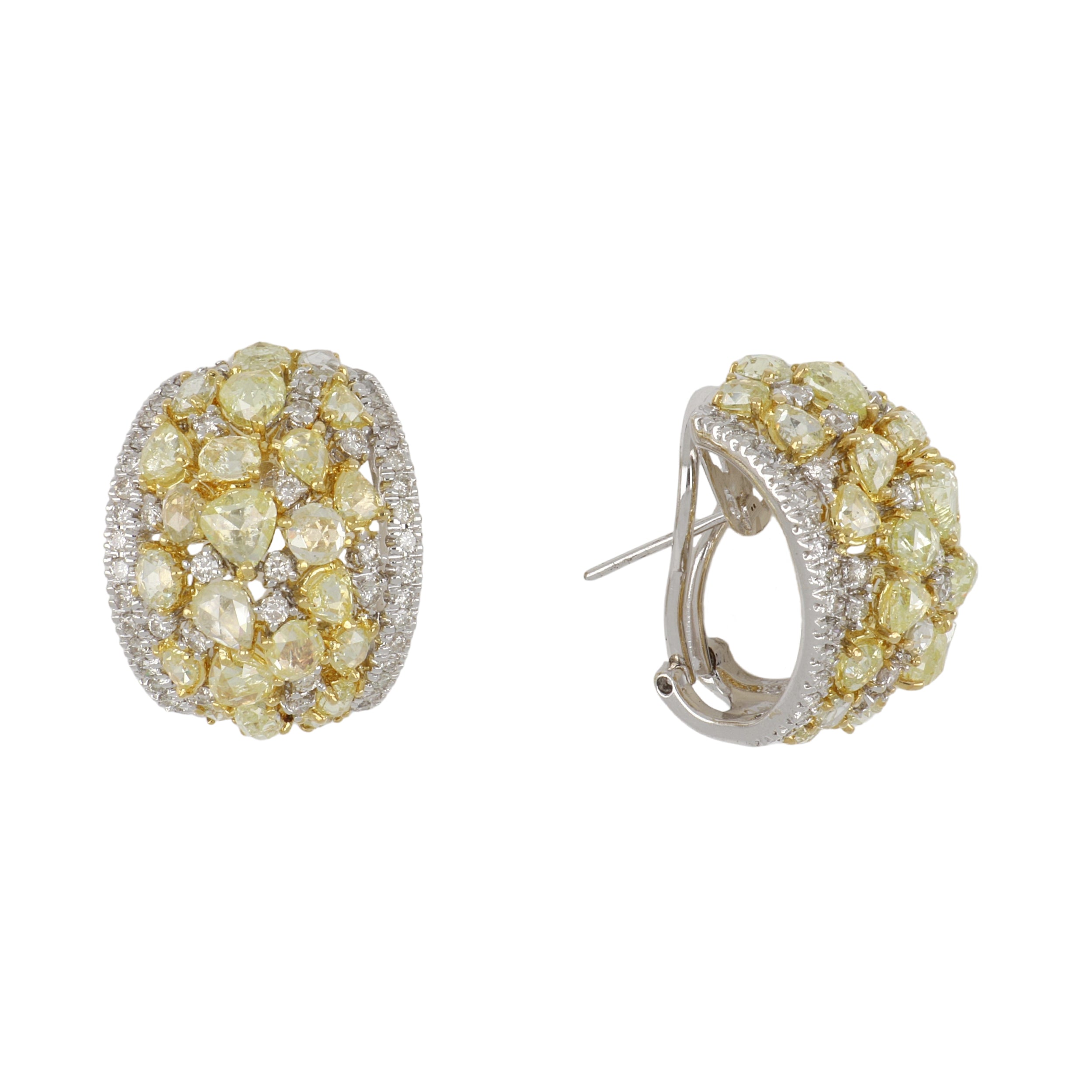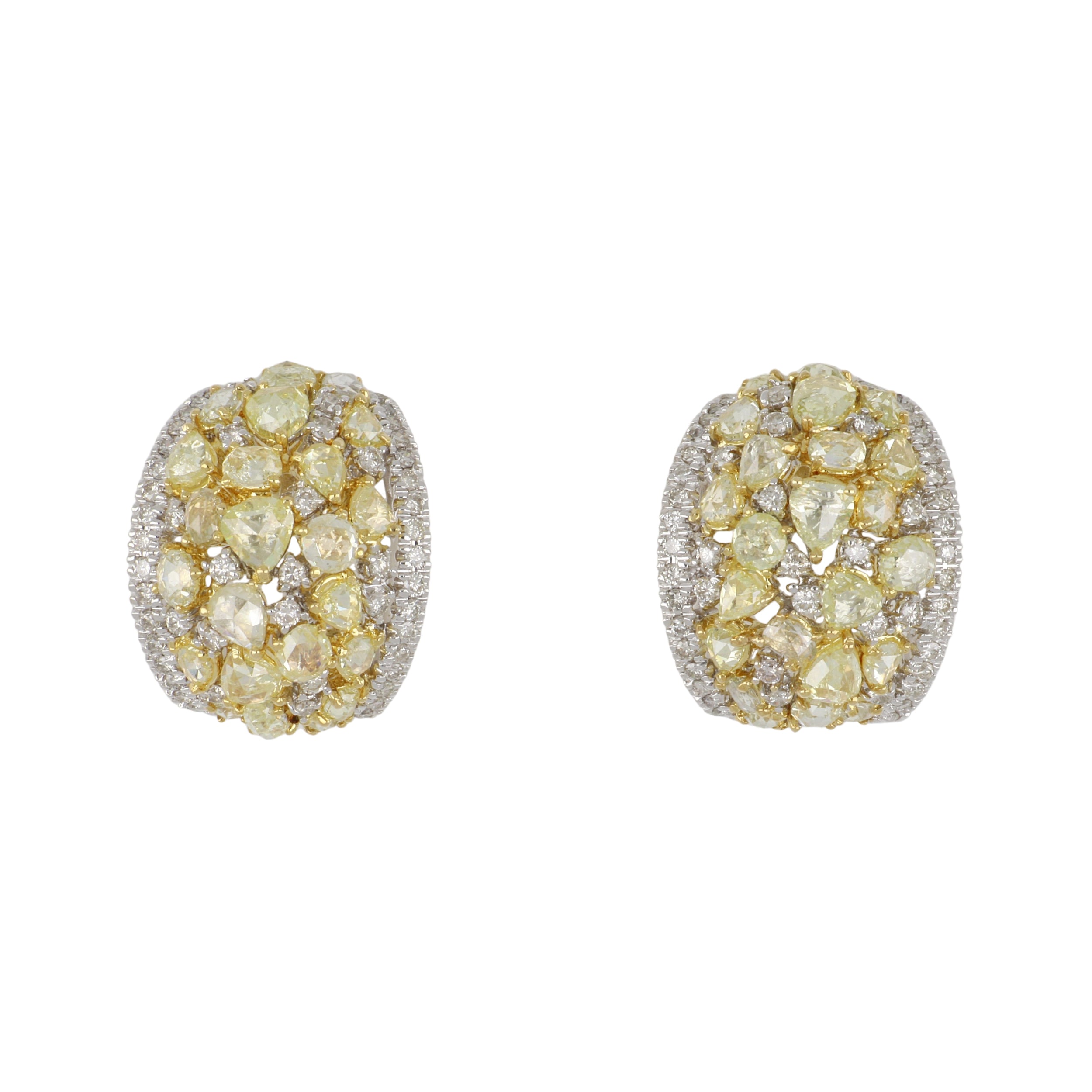 A pair of estate mixed fancy shape fancy yellow diamond cobblestone hoop earrings with round white diamond borders, set in 18K white and yellow gold. Circa 2000.