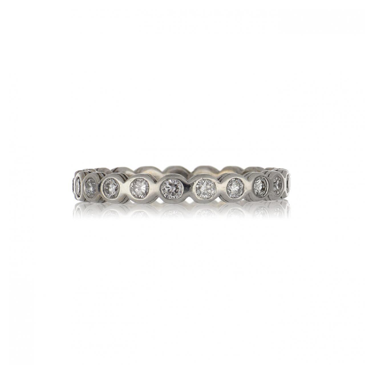 An estate vintage, bezel-set round brilliant-cut diamond eternity band, set in 18k white gold.