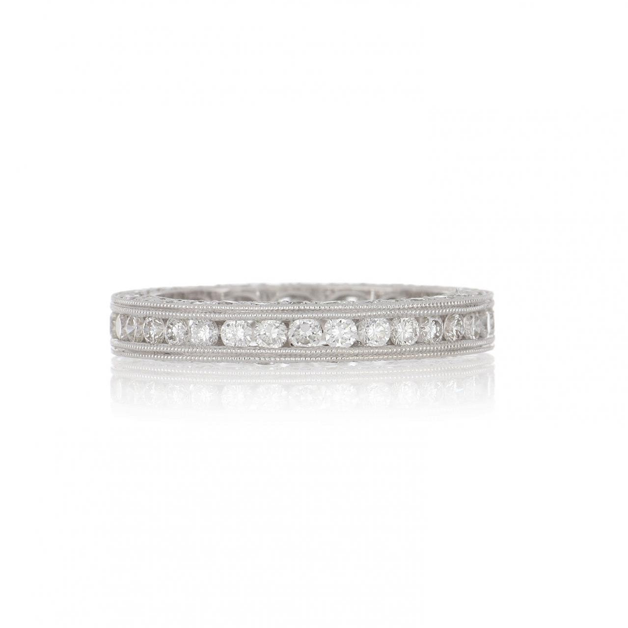 An estate 18K white gold three sided channel and pavé set round brilliant-cut diamond band.