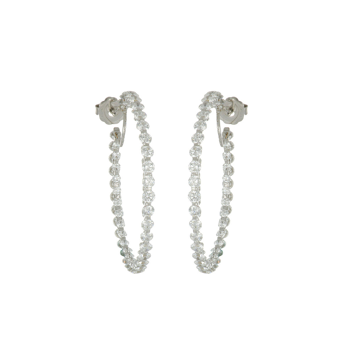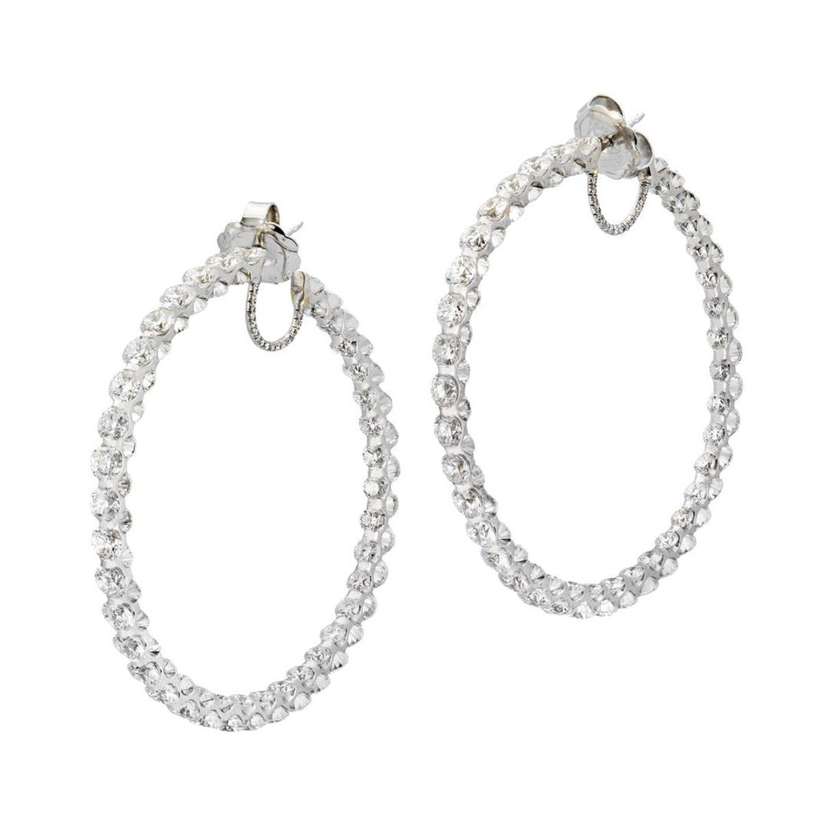 A pair of estate important modern 18k white gold double-sided diamond hoop c2000. Earrings feature a continual line of bar-set diamonds on the inside and the outside hoop, earrings have a left and a right.