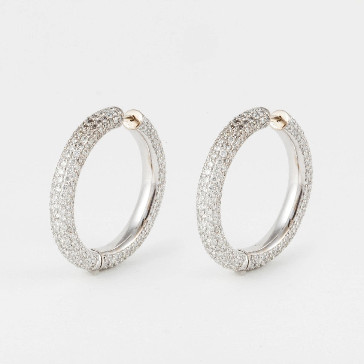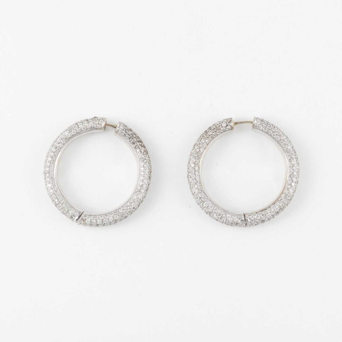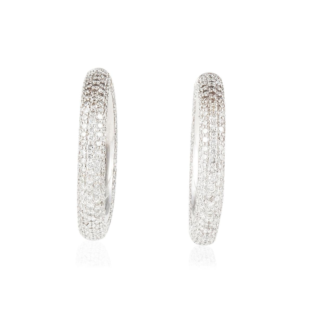 A pair of estate 18K white gold pavé round brilliant-cut diamond hoops. Circa 2010.