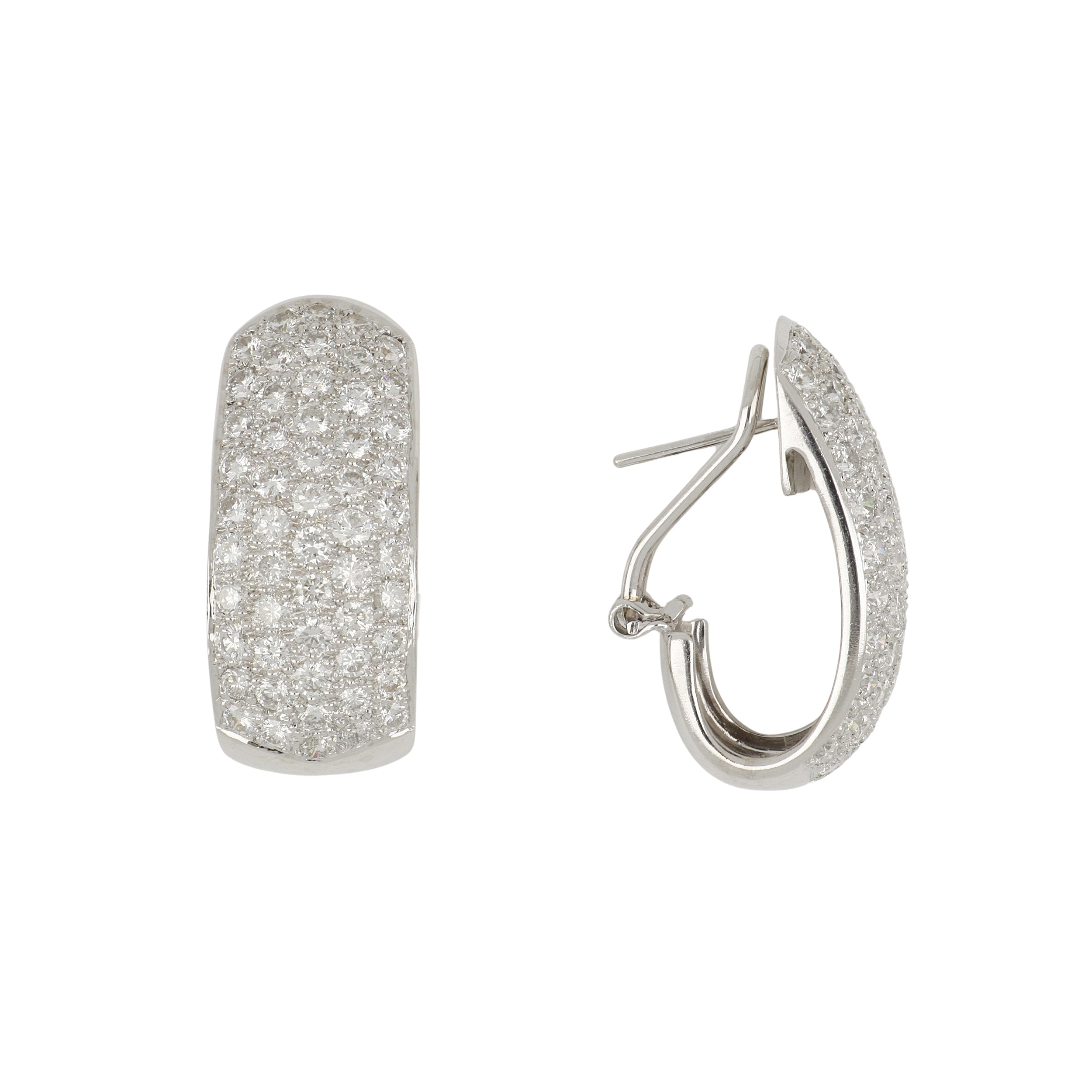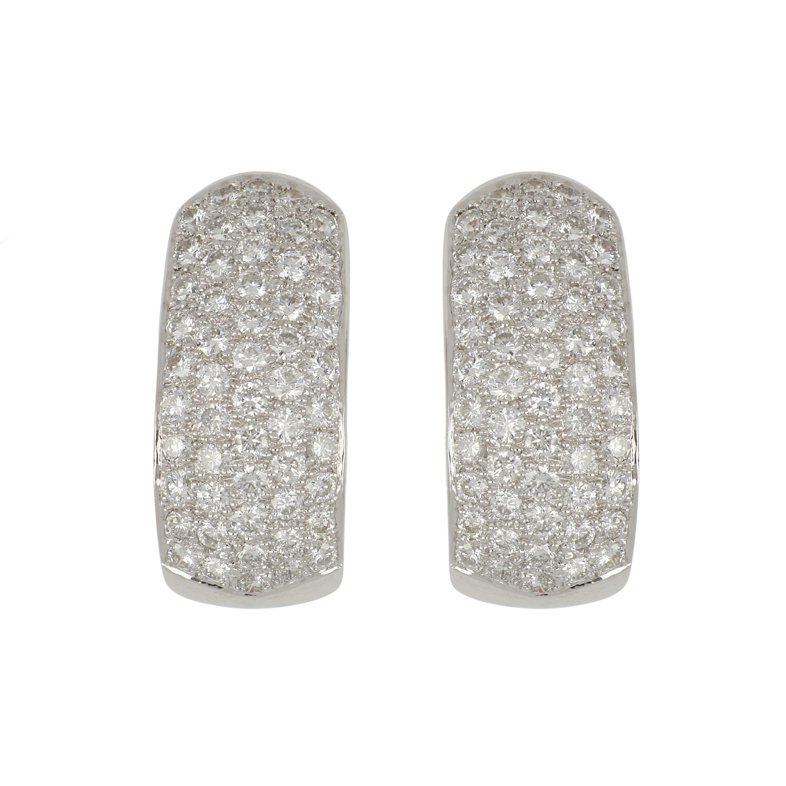 A pair of estate pave-set, five row round brilliant-cut diamond j-hoop earrings set in 18K white gold. Circa 2000.