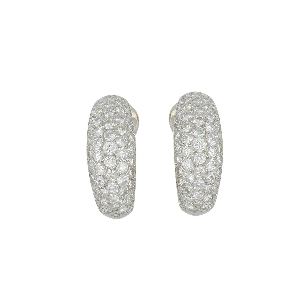 A pair of estate classic modern, pave round brilliant-cut diamond j-hoop earrings in 18k white gold.