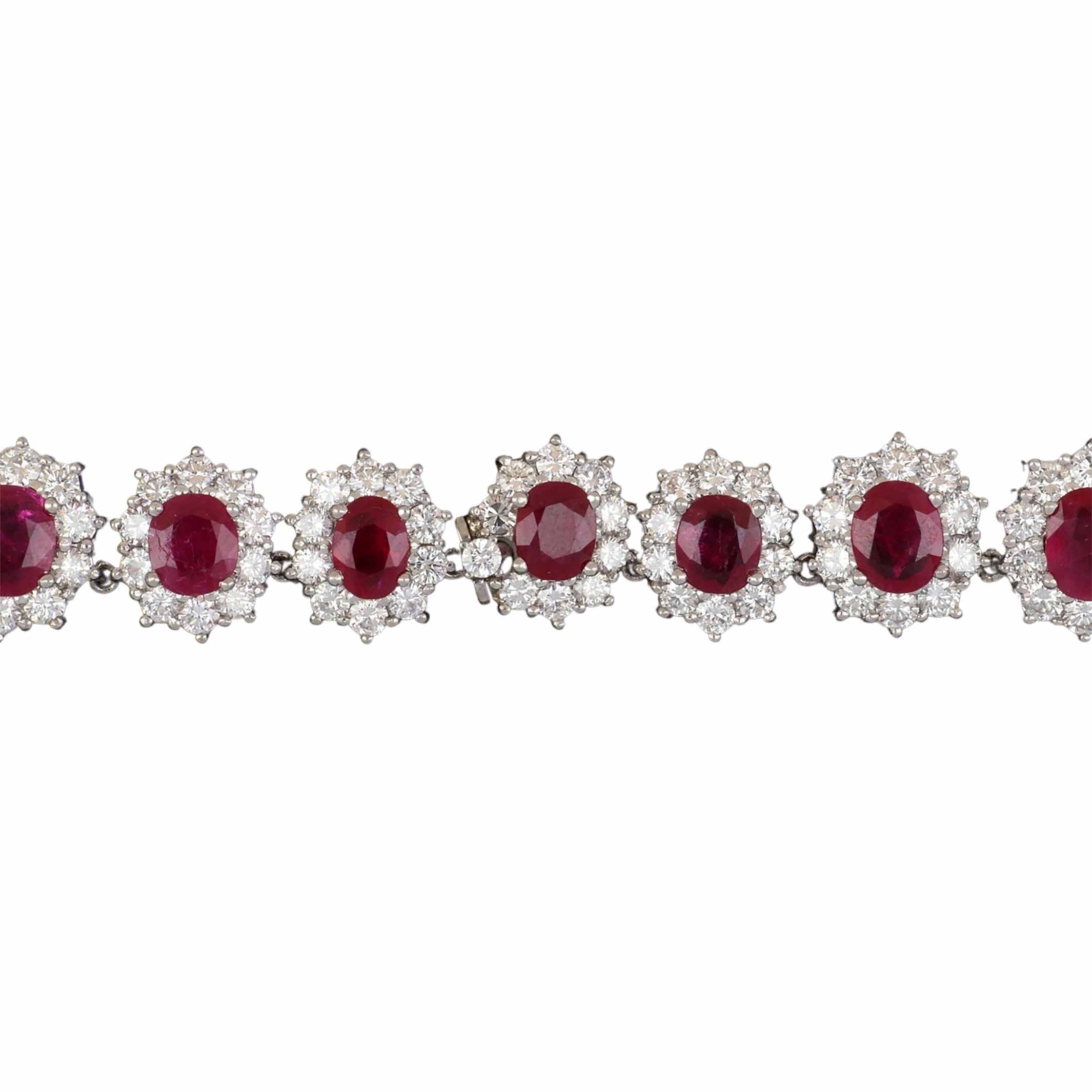 An estate oval-cut ruby and round brilliant-cut diamond jewelry suite, featuring a collar necklace and clip earrings, set in 18K white gold and platinum. Circa 2000.