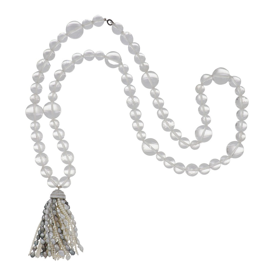 An estate rock crystal, multicolored freshwater pearl, and diamond tassel necklace, set in 18k white gold. Circa 2000.