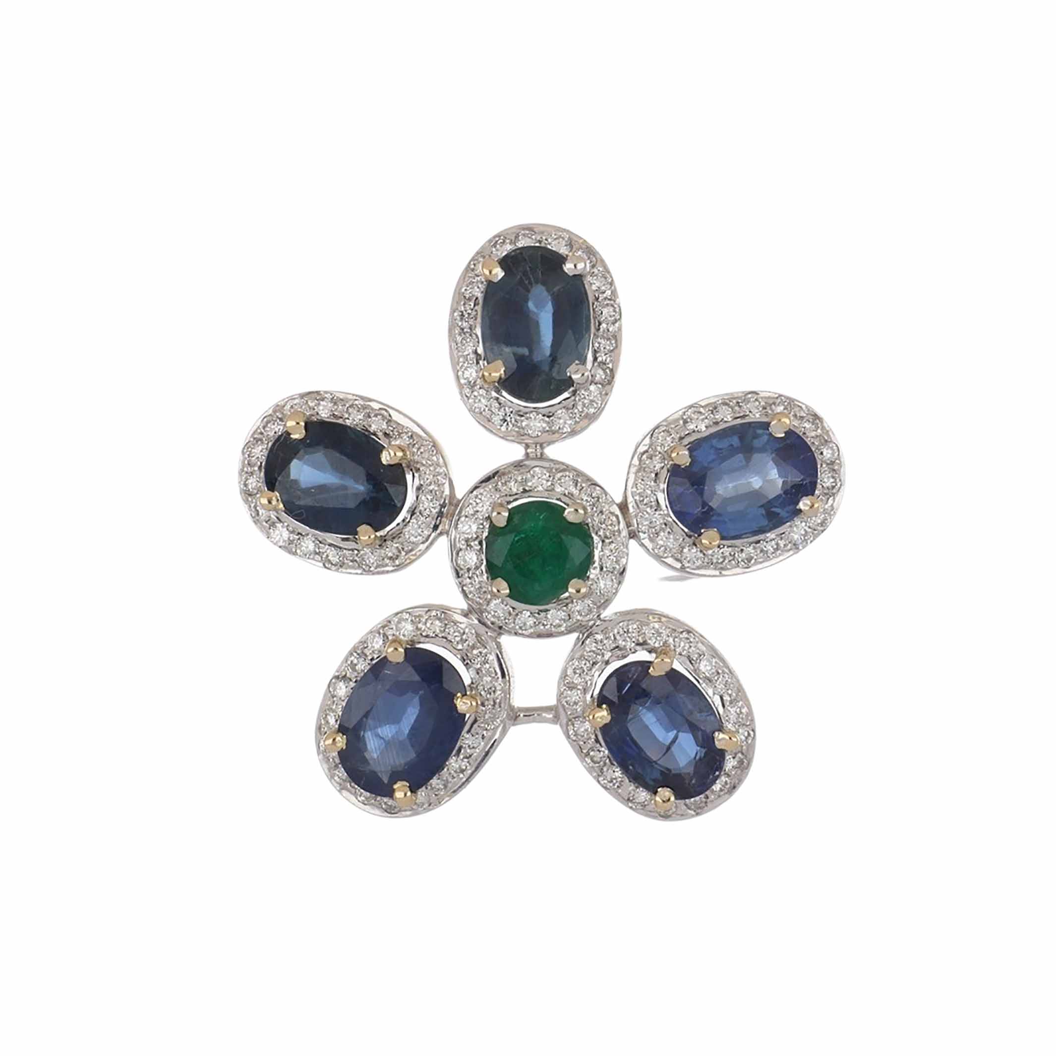 A pair of estate floral motif oval-cut sapphire and round brilliant-cut diamond earrings with round emerald centers, set in 18K yellow and white gold. Circa 2000.