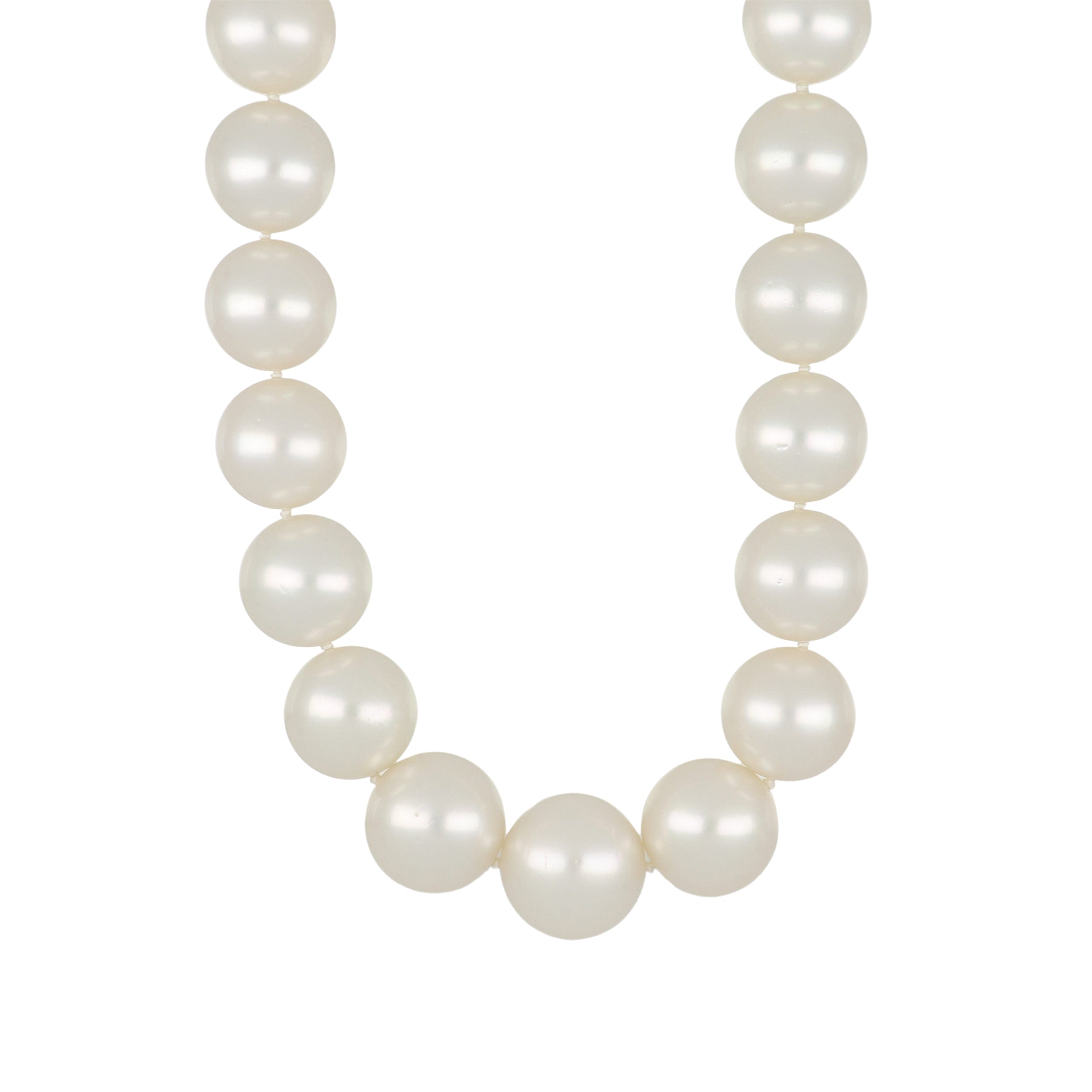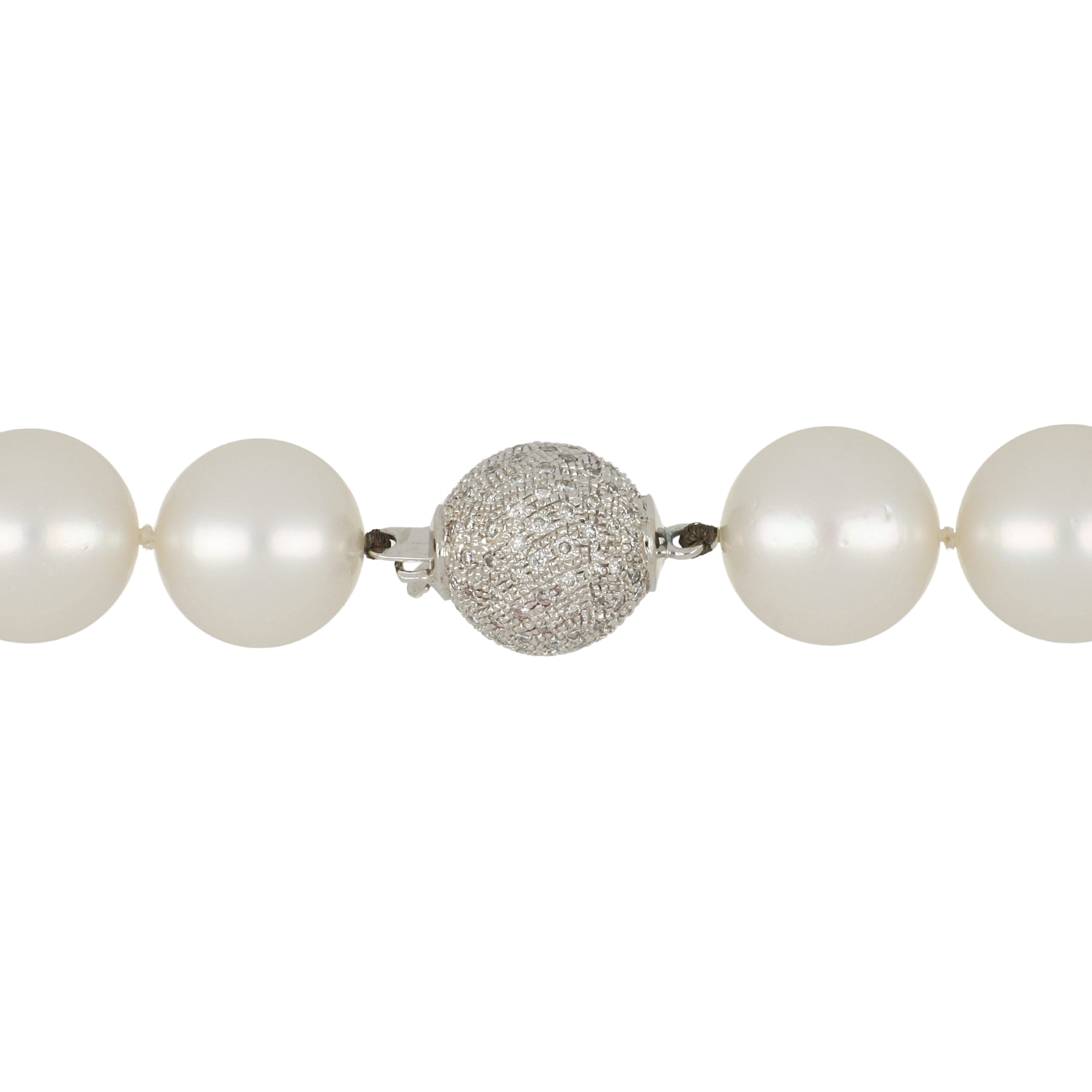 An estate graduated South Sea pearl necklace with a decorative pave round brilliant-cut diamond ball clasp set in 18K white gold. Circa 2000.