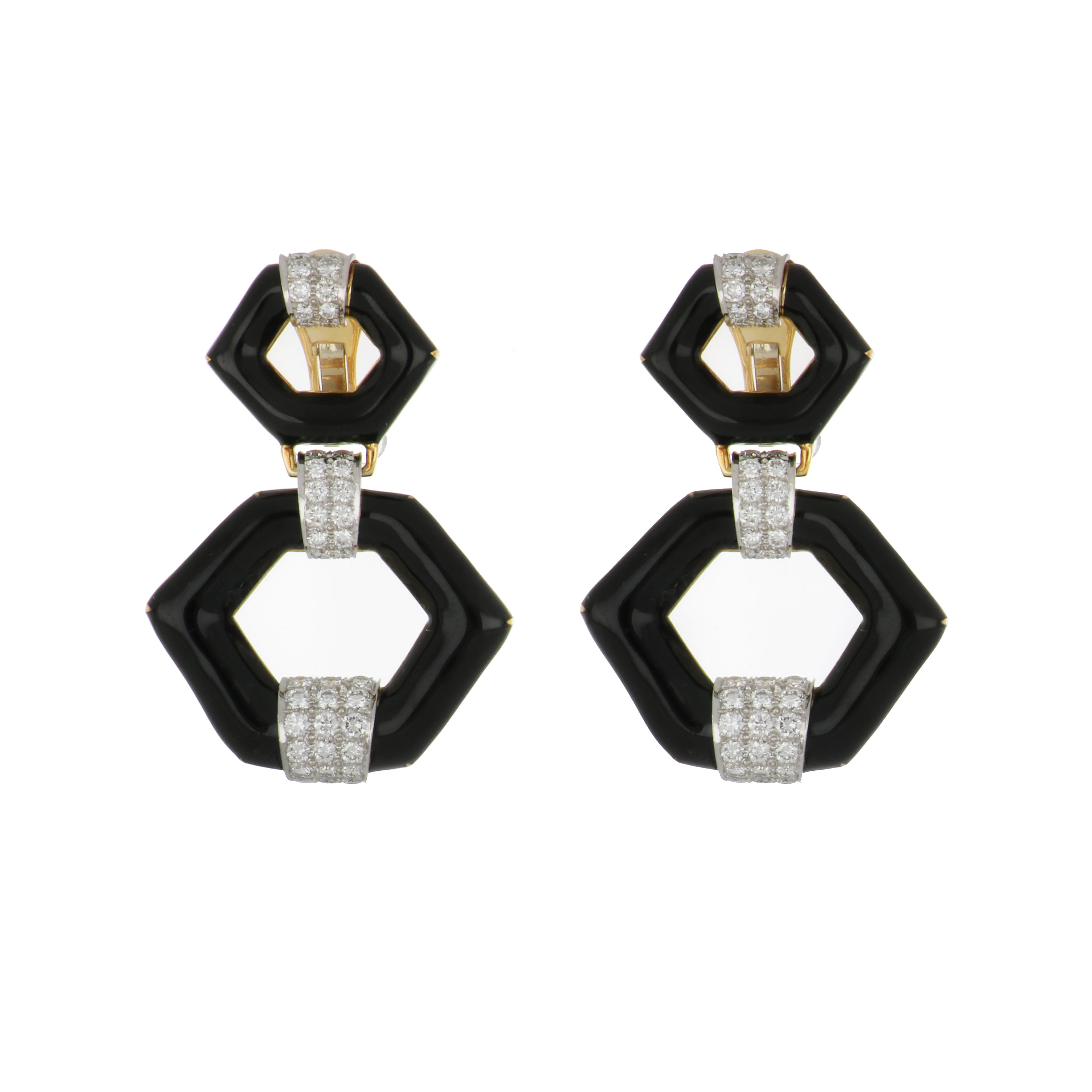 An estate pair of David Webb black enamel hexagon drop earrings with diamond accents, set in 18K yellow gold.