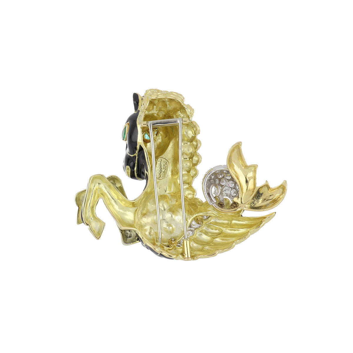 An estate David Webb 18K yellow gold and platinum black enamel pegasus seahorse (hippocampus) brooch with emeralds and diamonds. From the Kingdom Collection.