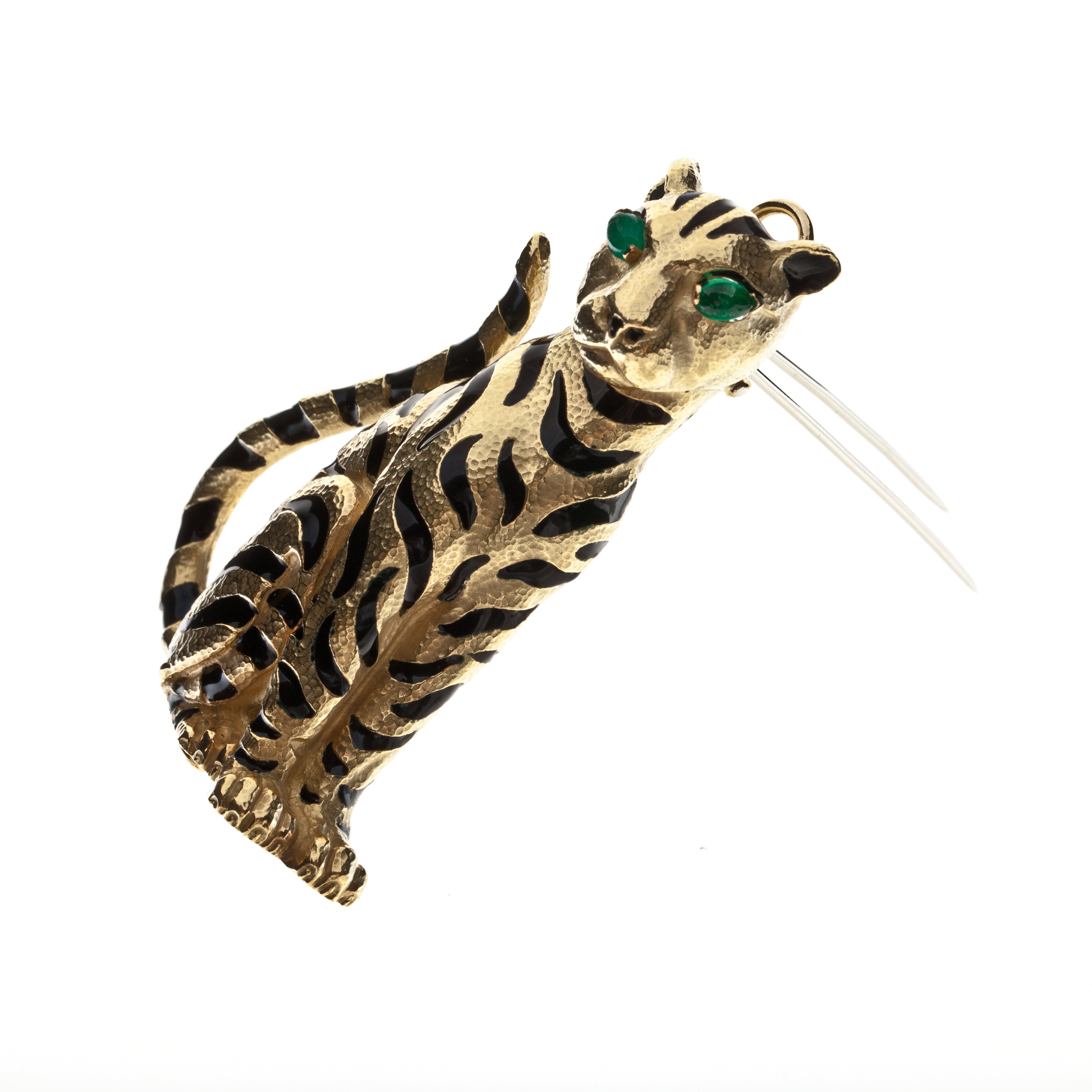 Estate David Webb 18K Gold Enameled Tiger Brooch with Emeralds