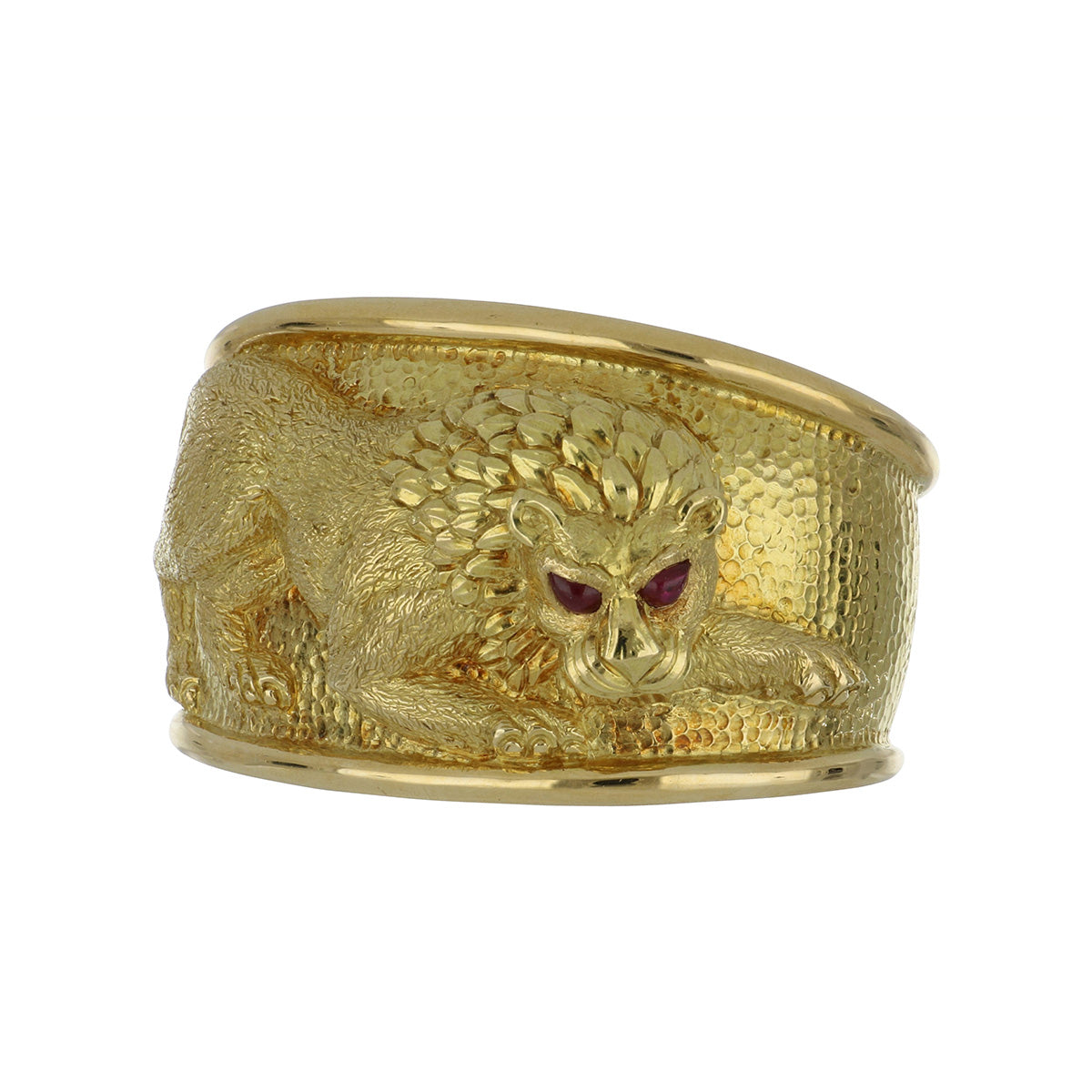 An estate David Webb repousse lion cuff in 18K yellow gold with 2 pear-shape cabochon ruby eyes. From the Repousse Collection.