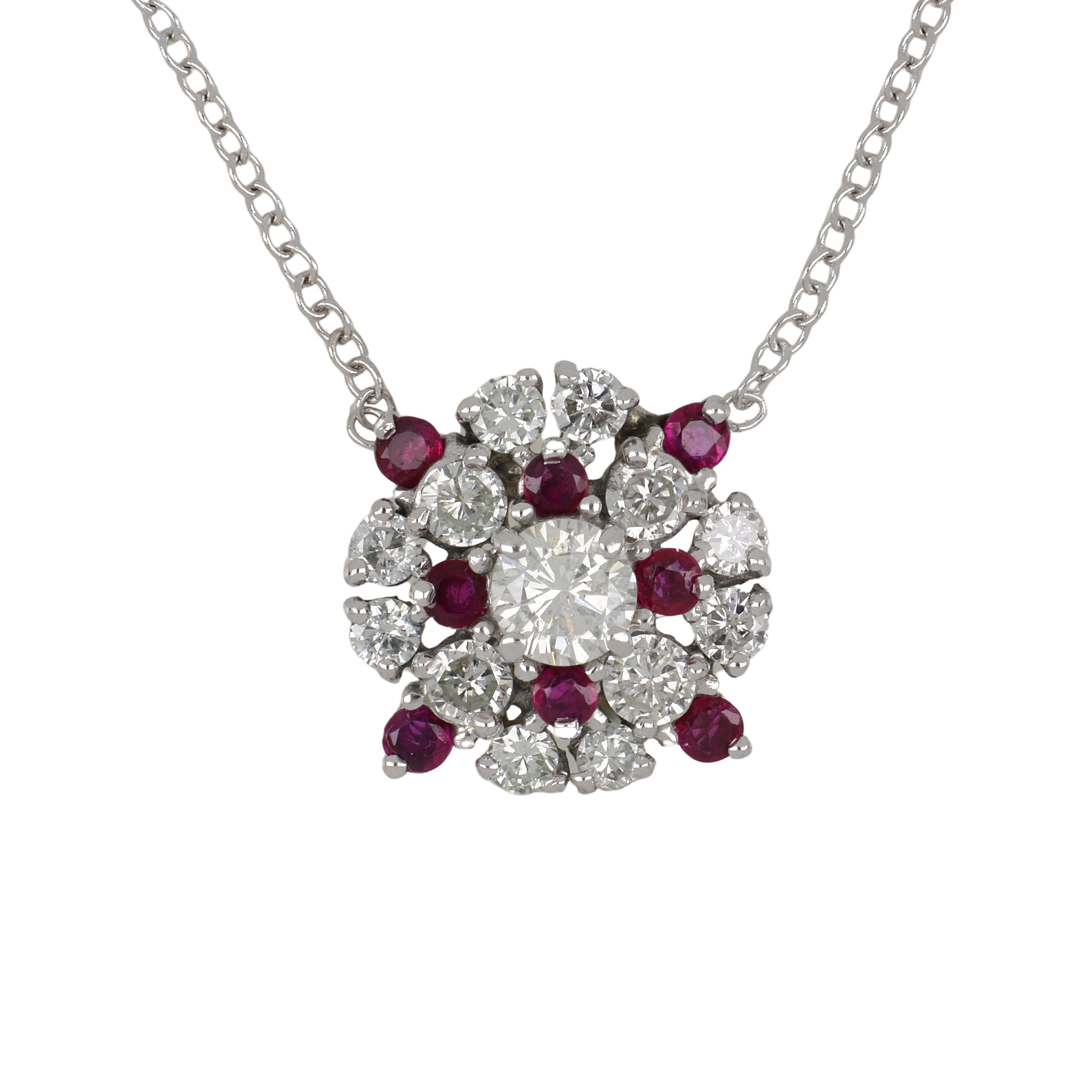 An round brilliant-cut diamond and ruby cluster pendant necklace, set in 14k white gold.