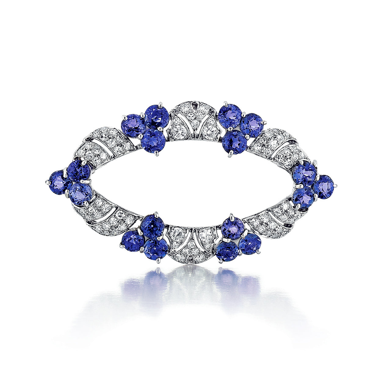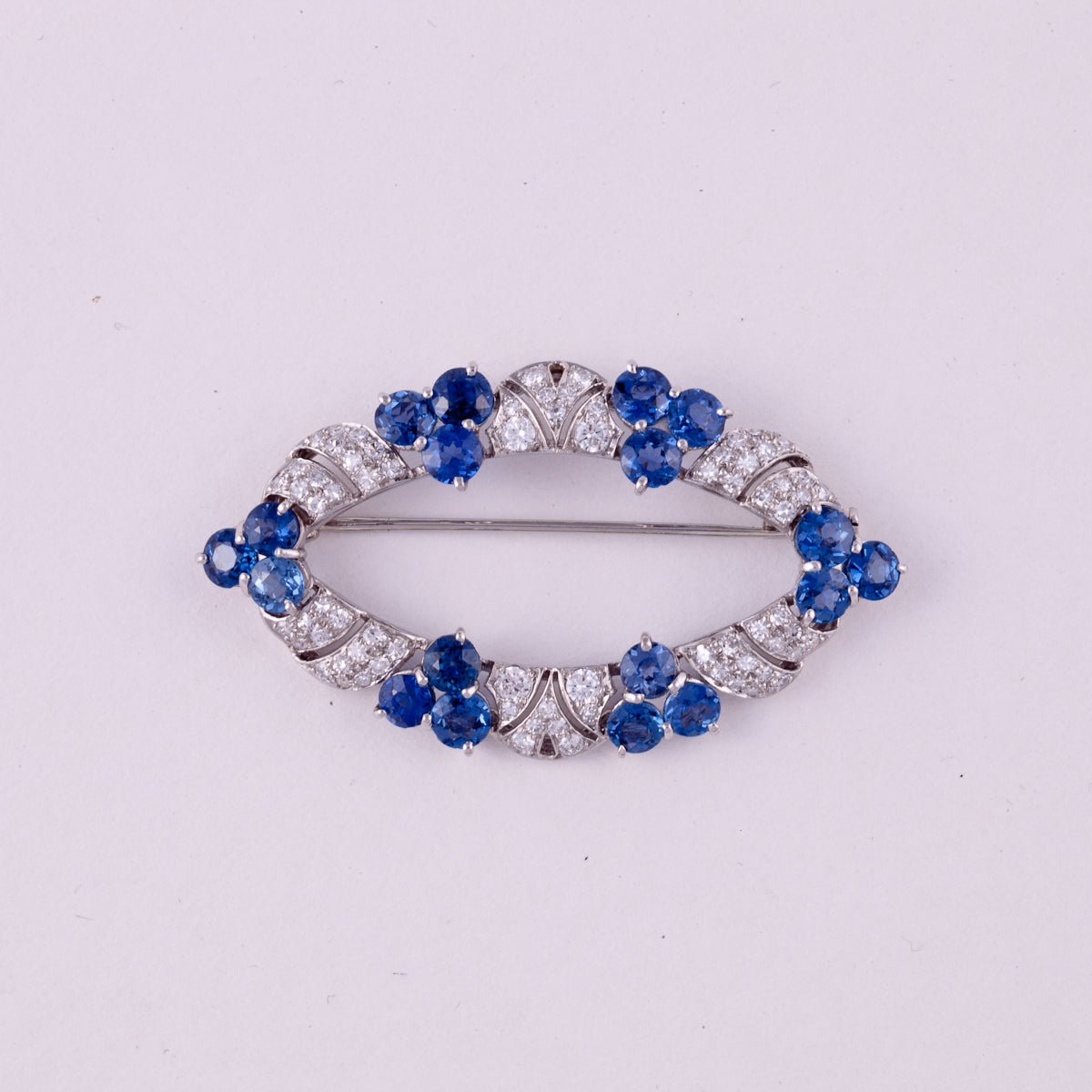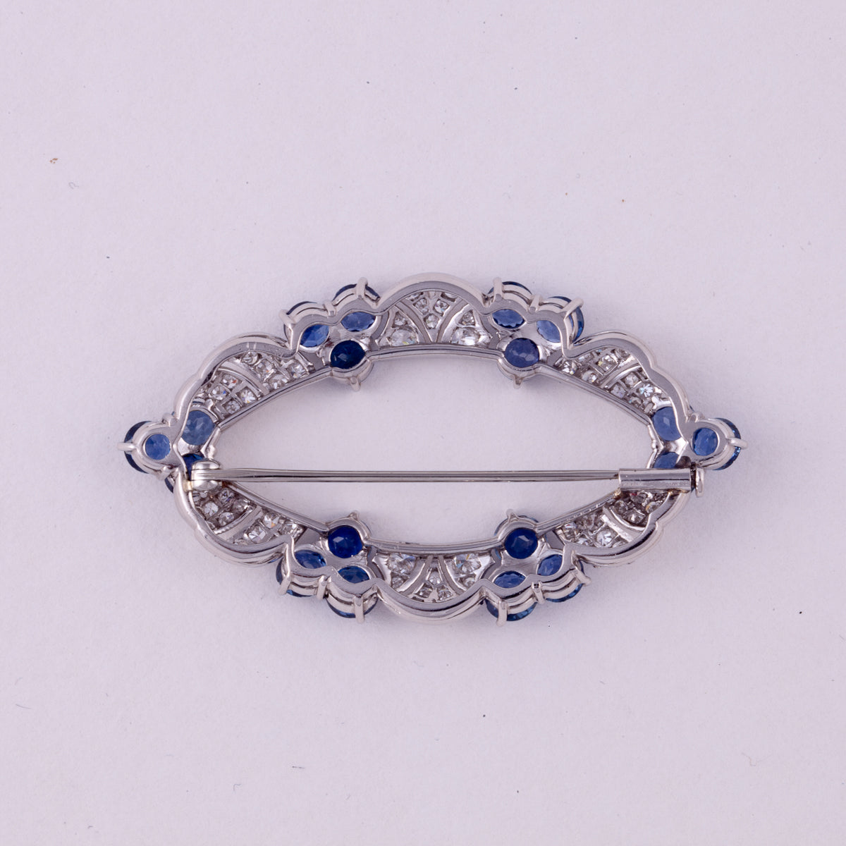 An estate Edwardian-style filigree open navette brooch, set with round-cut diamonds and trefoil sapphire accents, set in platinum.