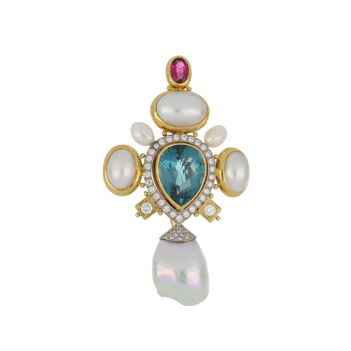 An estate Elizabeth Gage tourmaline, pearl and diamond brooch set in 18k yellow gold. Circa 2000.