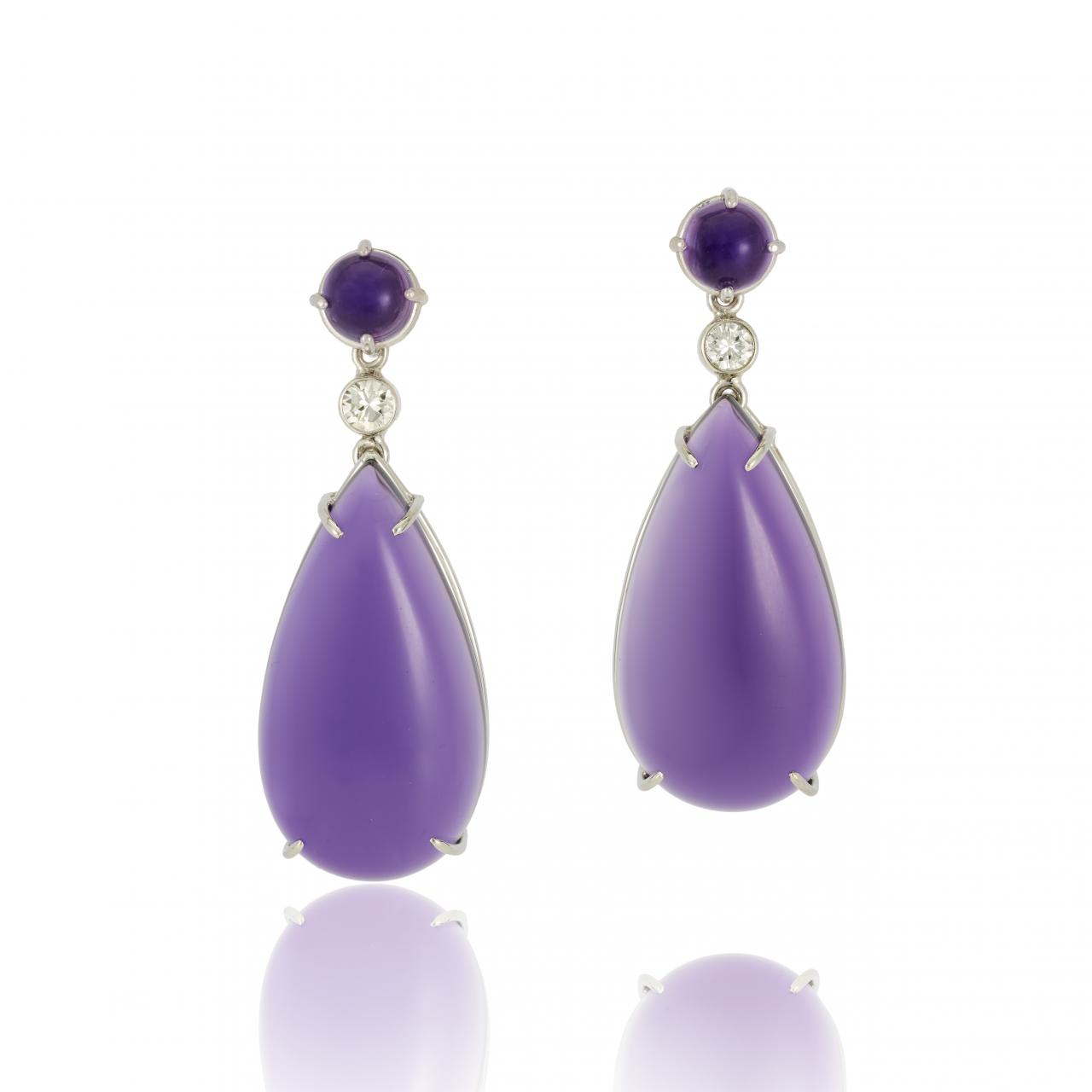 A pair of estate pear shape cabochon amethyst and round brilliant cut diamond drop earrings set in 18K white gold. French, circa 2000.