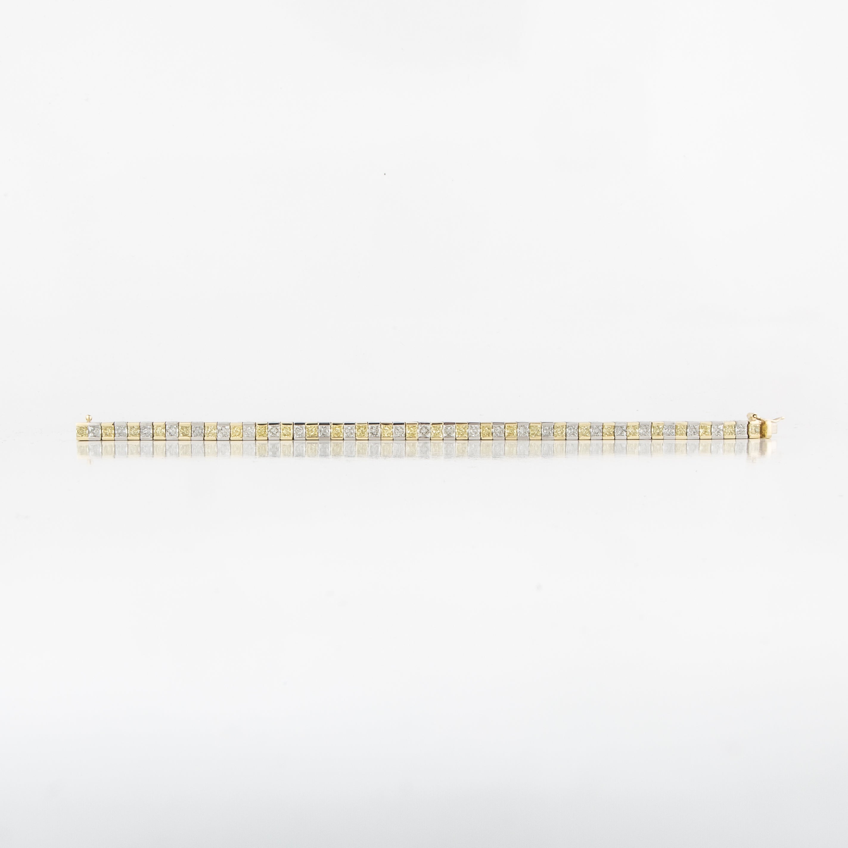 An estate modern, channel-set alternating fancy yellow and white diamond line bracelet set in platinum and 18k yellow gold. Circa 2000.