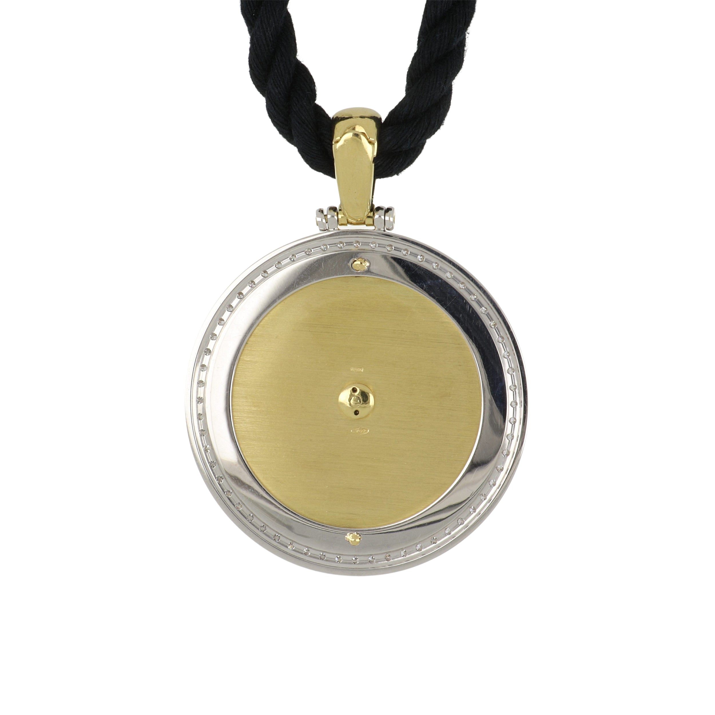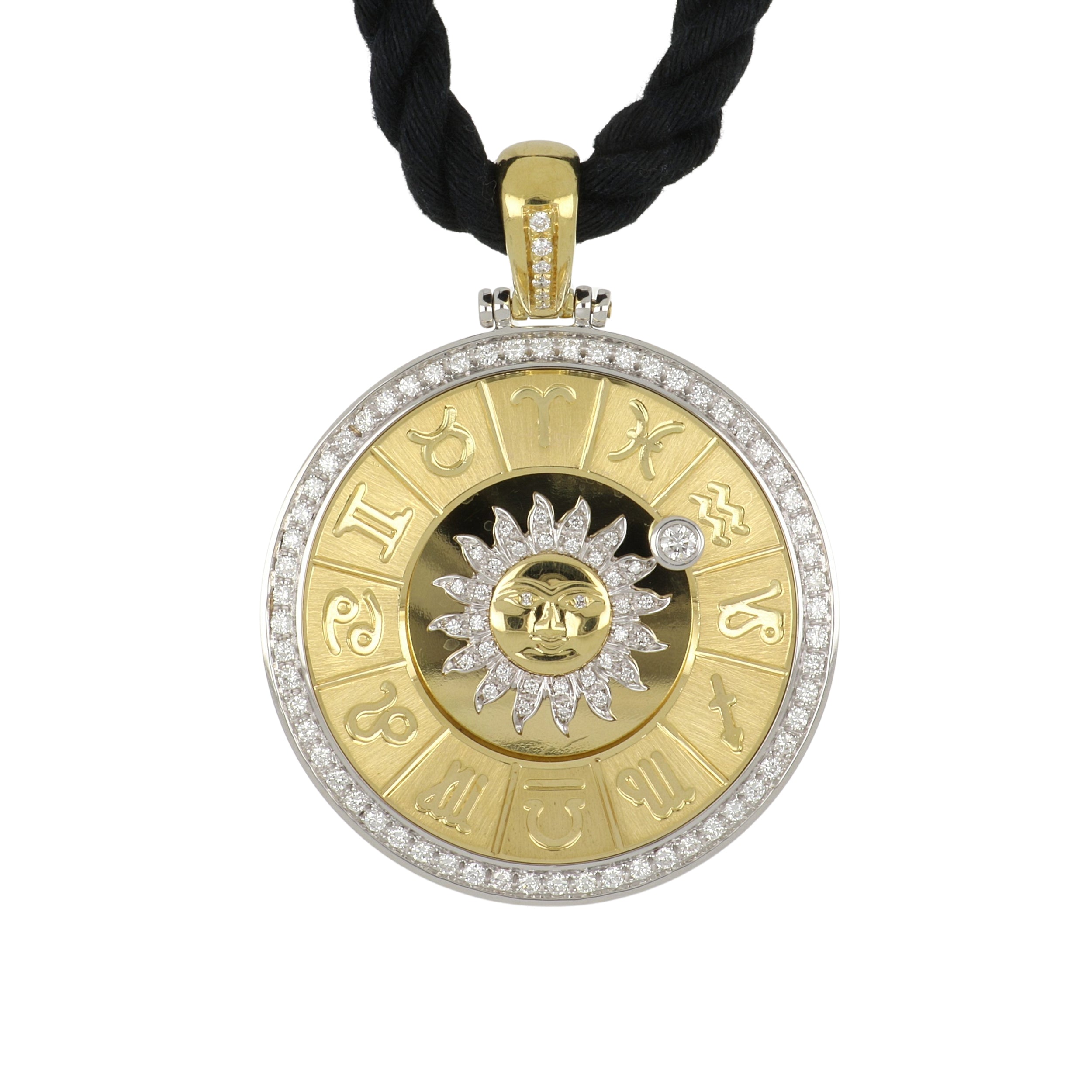 An estate 18K yellow and white gold zodiac medallion, with round brilliant-cut diamond frame and accents. Month indicator is adjustable - personalize to your own sign! Circa 2010. Italian.