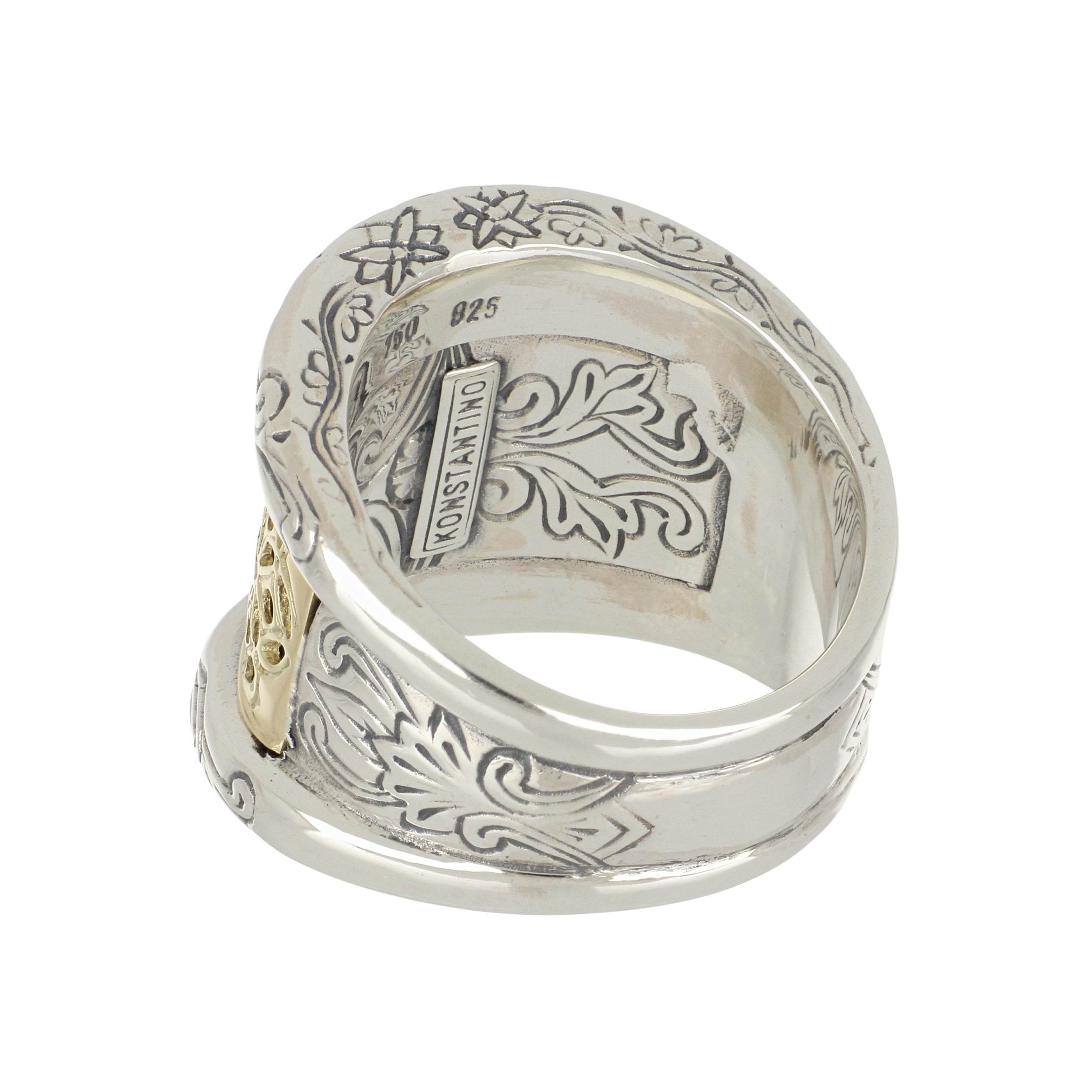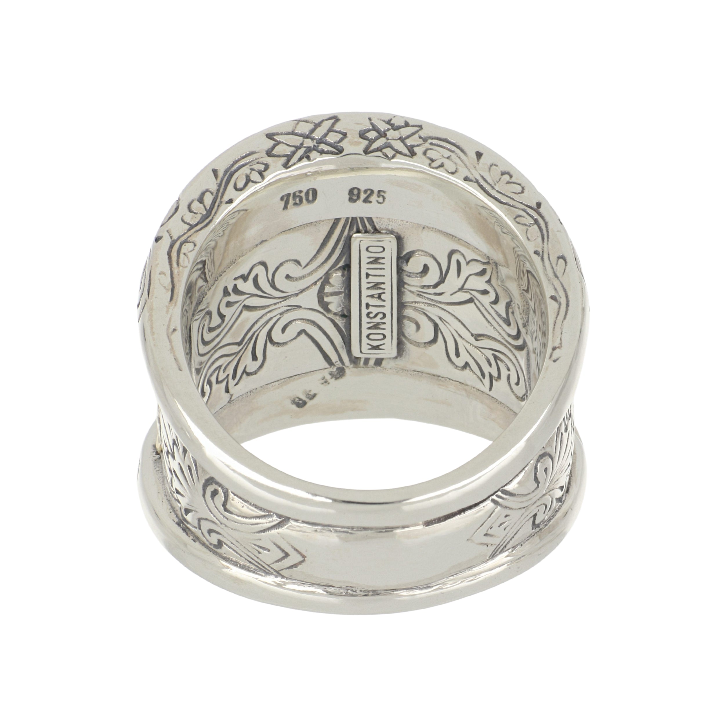 An estate Konstantino 18K yellow gold wide band with pierced center section and round brilliant-cut diamond accents, with engraved sterling silver edges. Circa 2000. Signed: Konstantino.