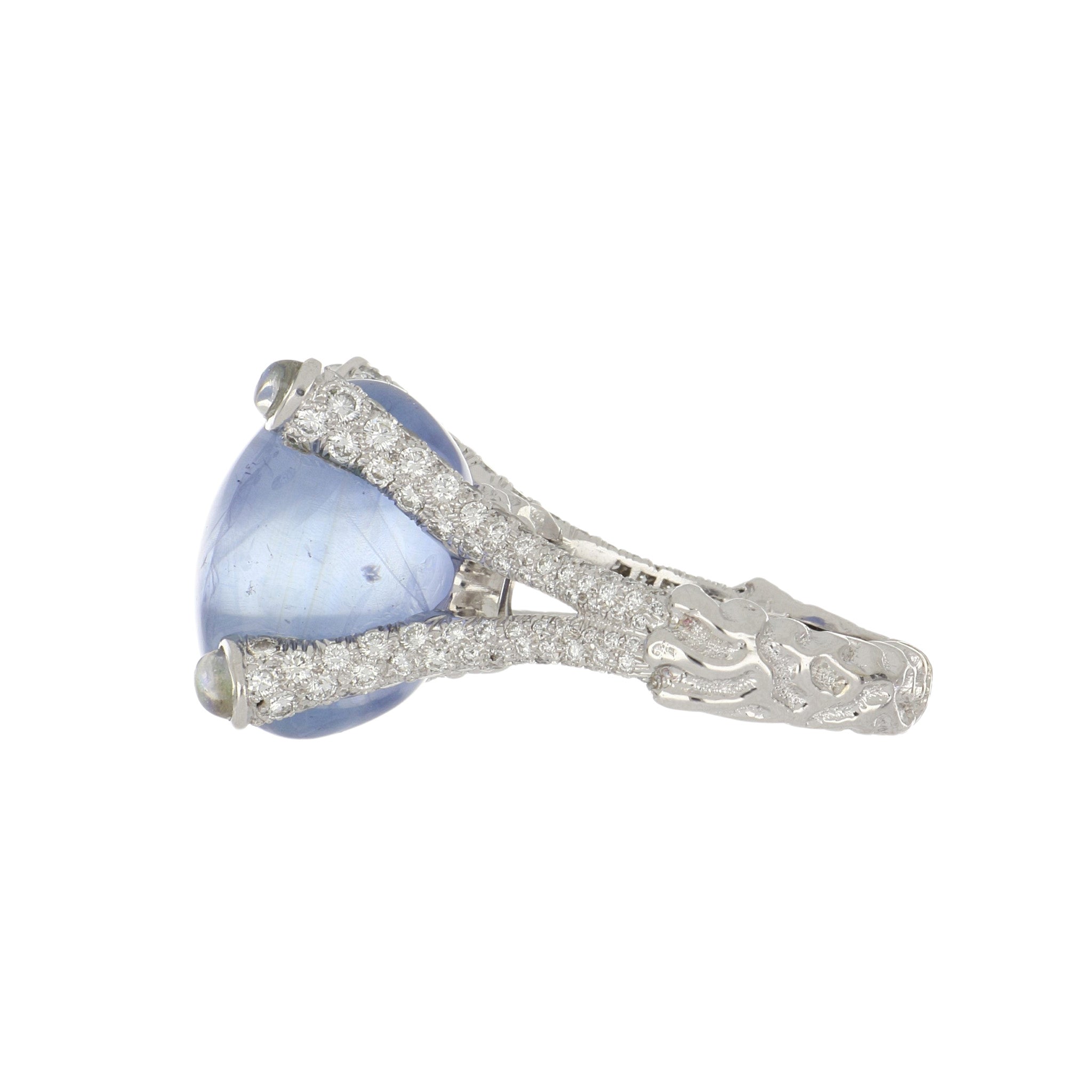 An estate Nicholas Varney oversized cabochon sapphire pebble ring with rainbow moonstones & diamonds, set in 18K white gold. Circa 2010.