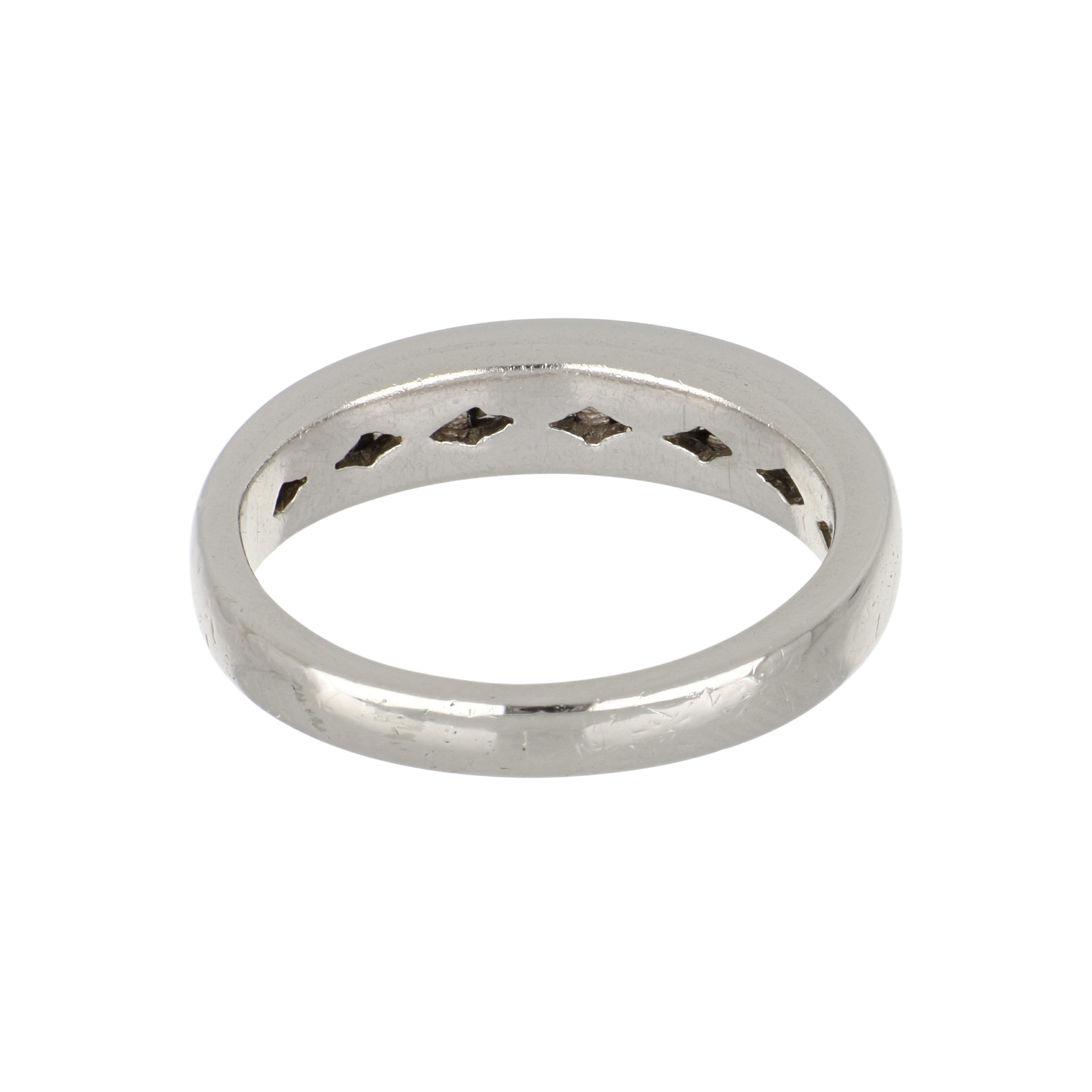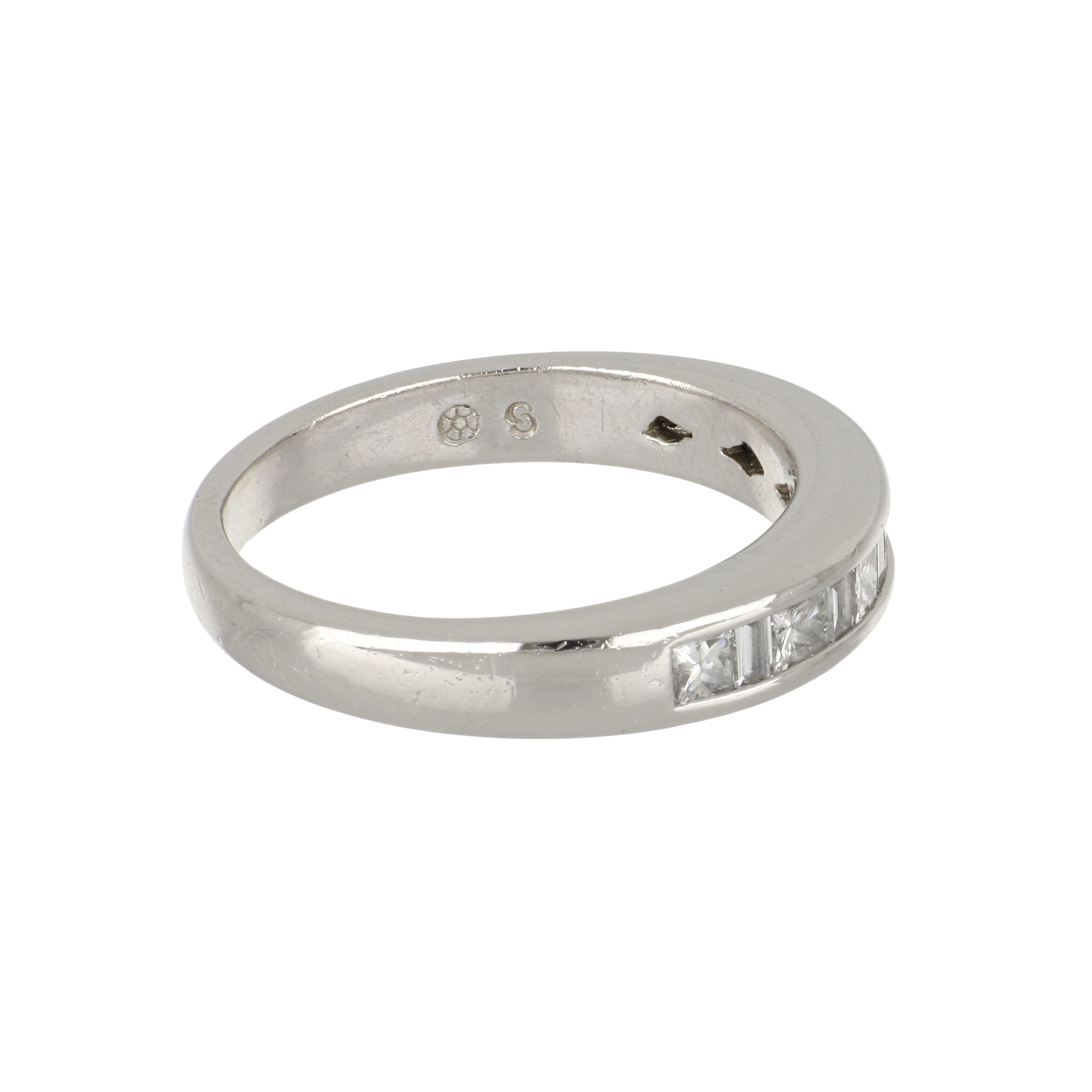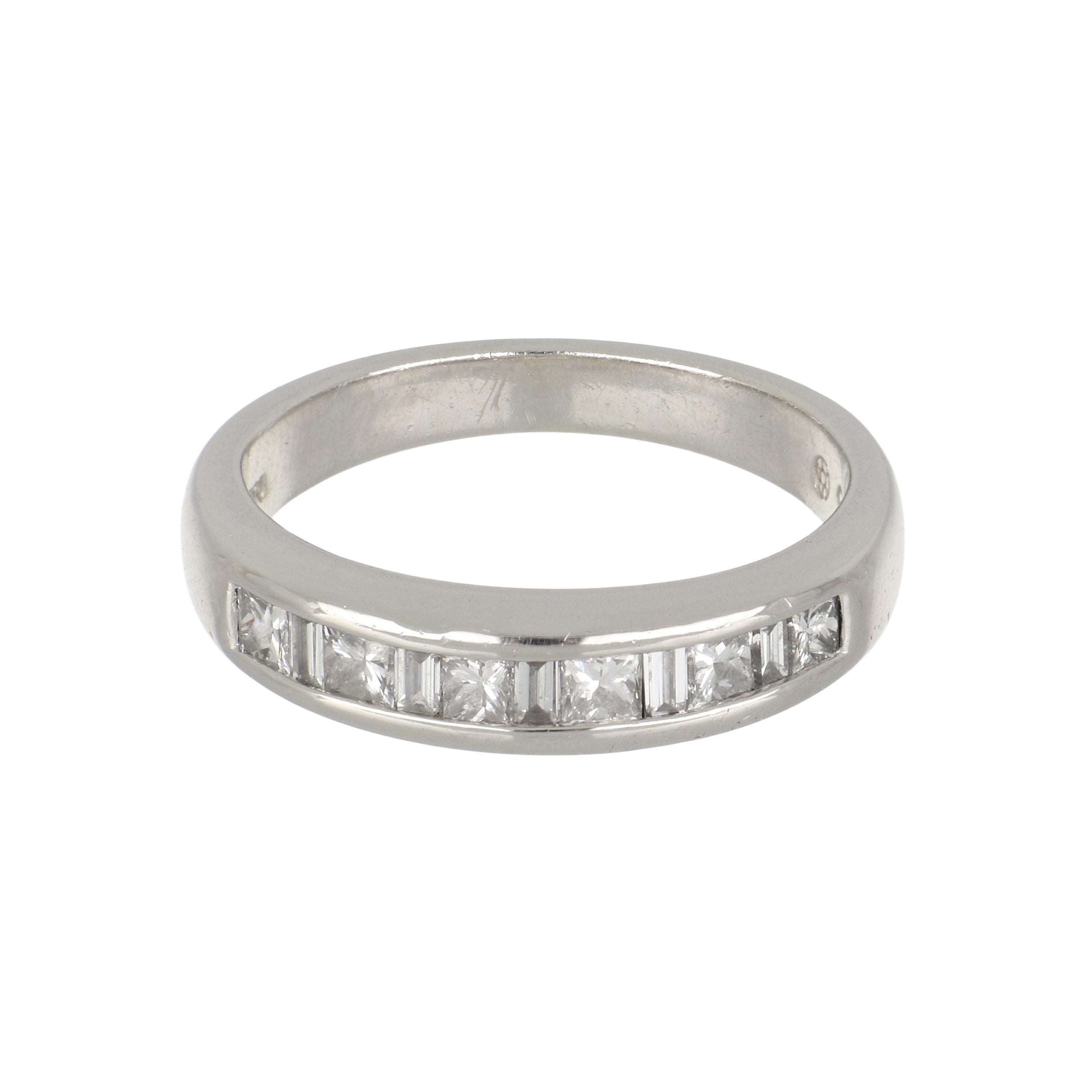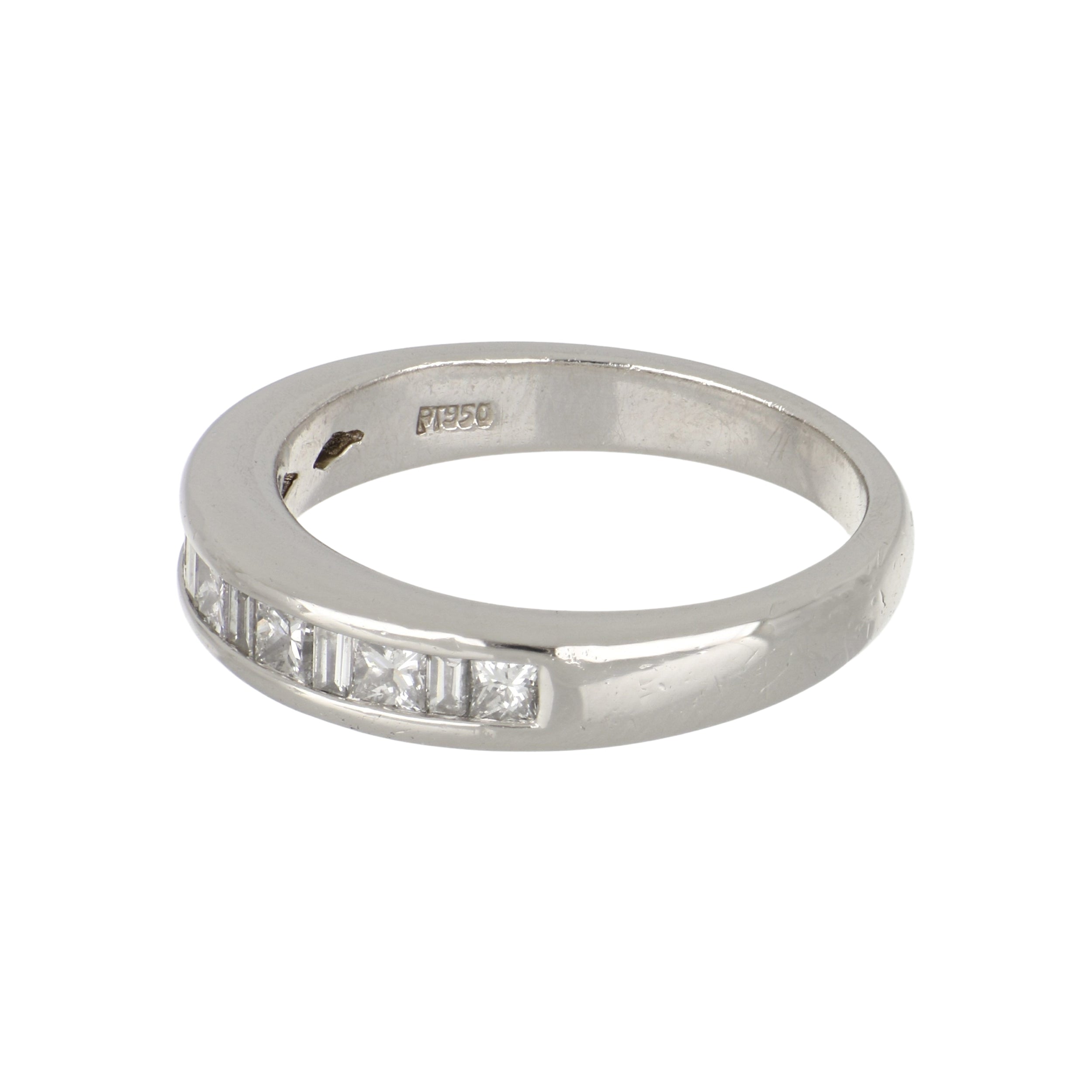 An estate alternating princess and baguette-cut diamond channel-set band set in platinum. Circa 2000.