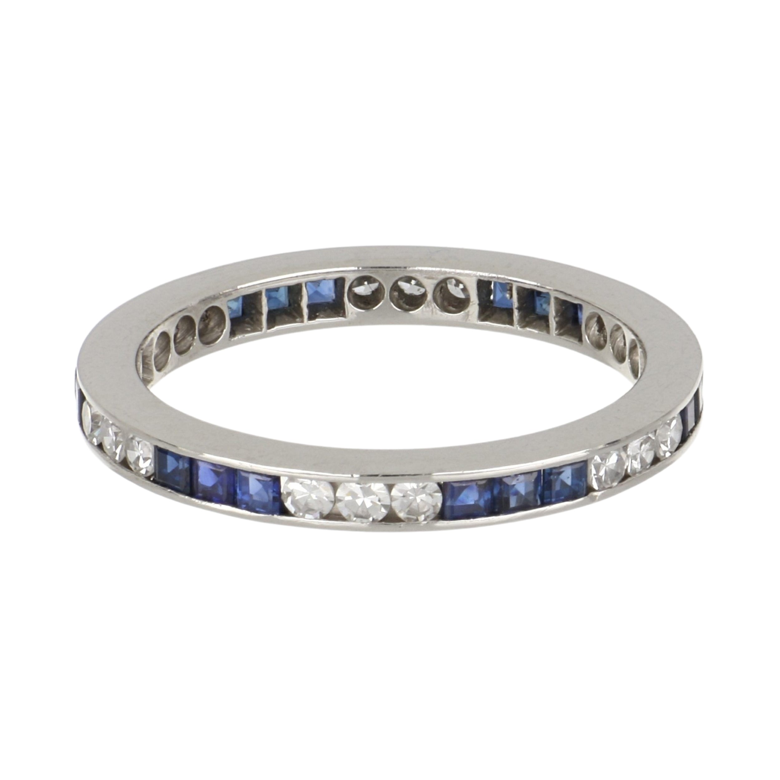 An estate alternating channel-set square-cut sapphire and single-cut diamond eternity band, set in platinum. Circa 2000.