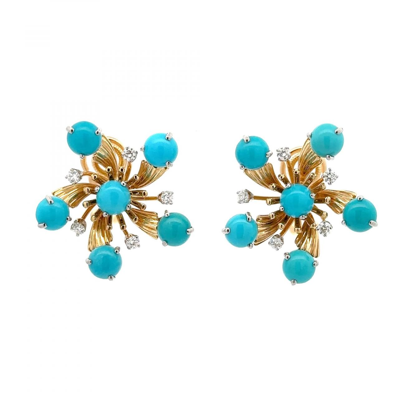 A pair of estate vintage, Tiffany & Co. Schlumberger Studios, cabochon turquoise snowflake clip earrings with round brilliant-cut diamond accents, set in platinum and 18k yellow gold, Circa 2000