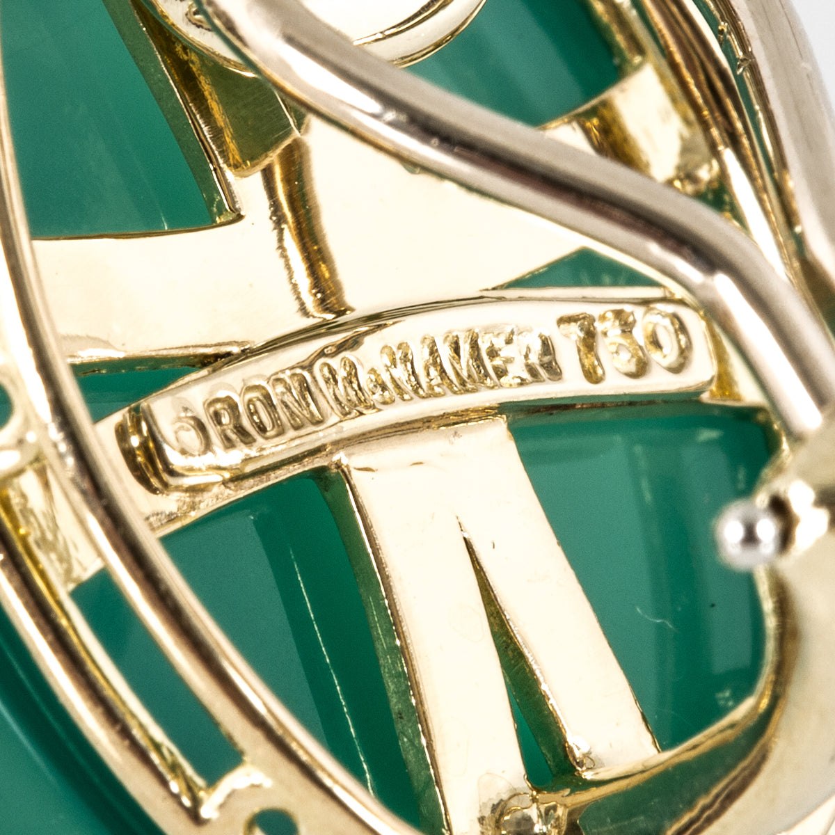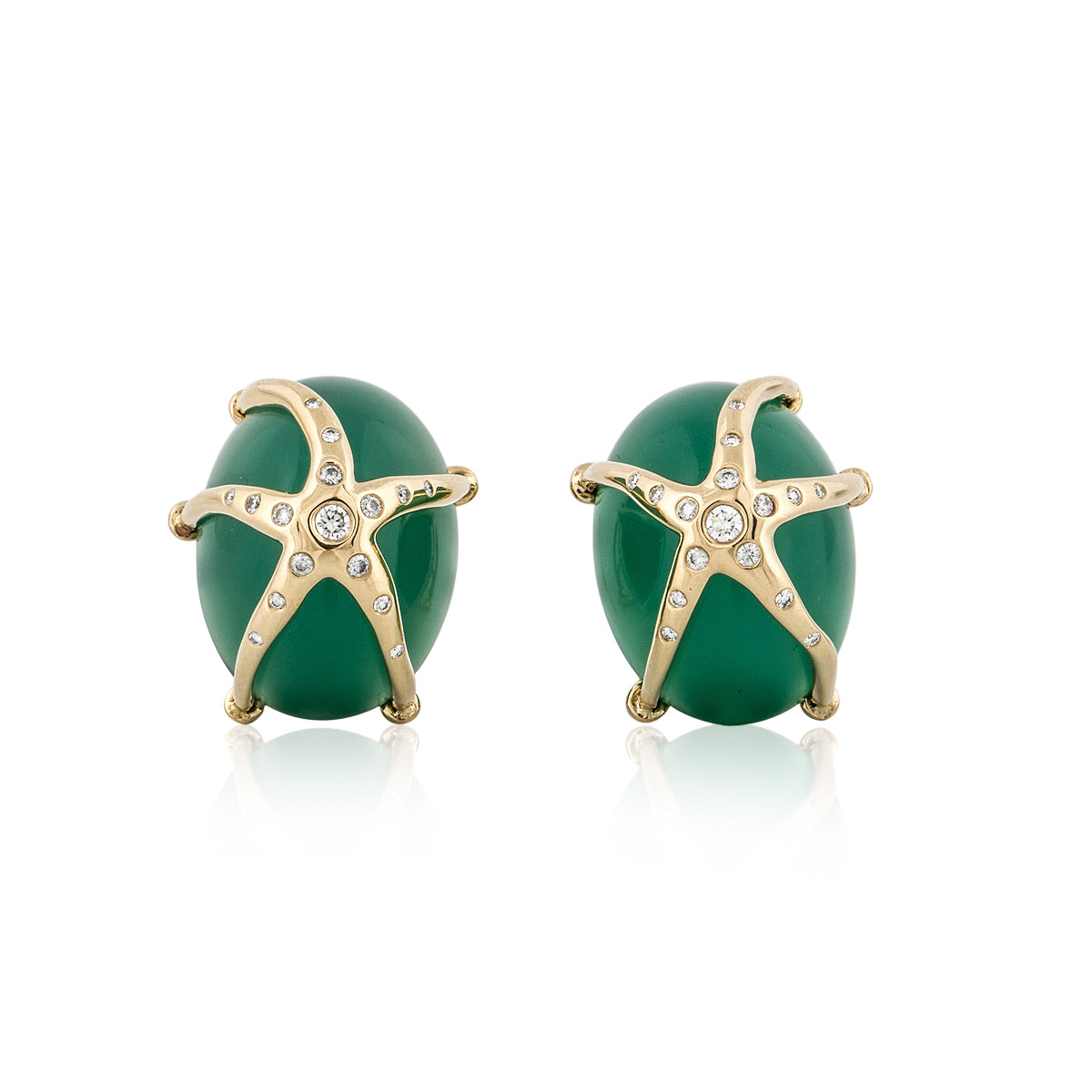 A pair of estate Ron McNamer chrysoprase earrings with starfish overlay in 18K yellow gold and diamonds. Circa 2000.
