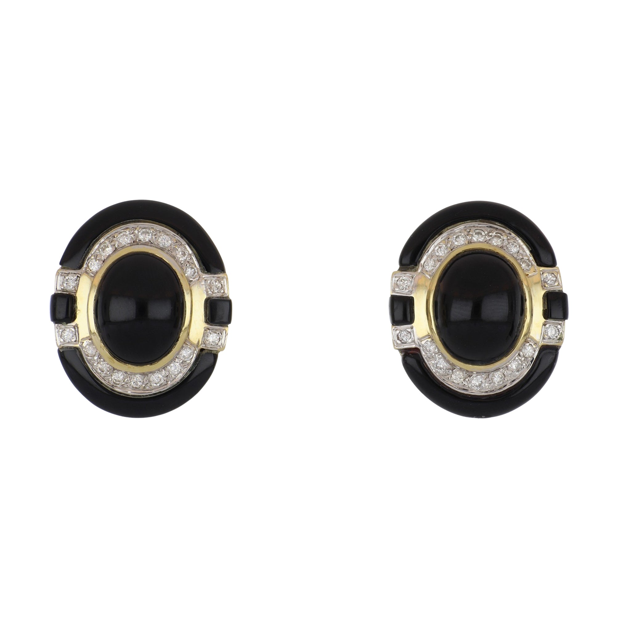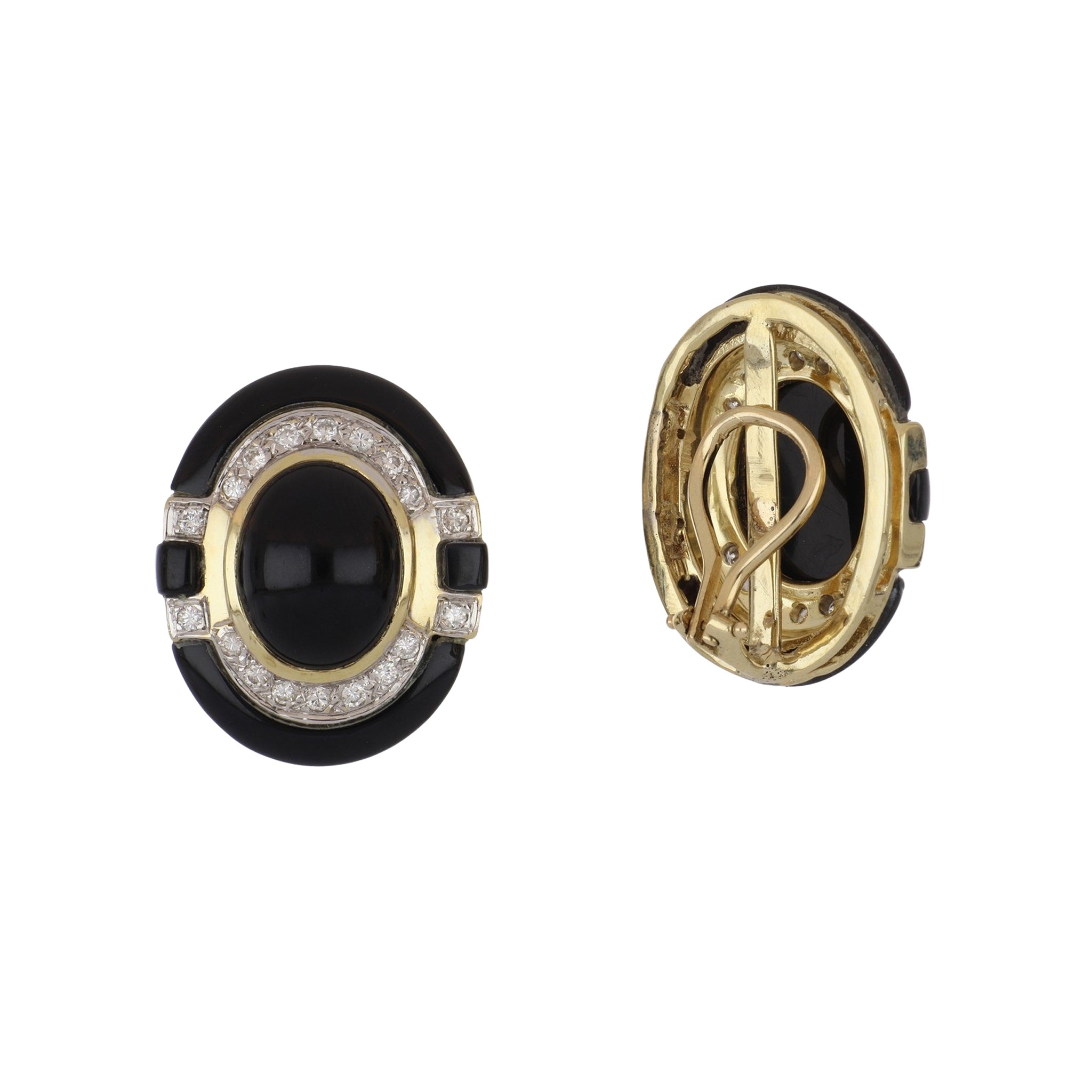 A pair of vintage onyx and round diamond oval clip earrings, in 14K yellow gold. Circa 1990.