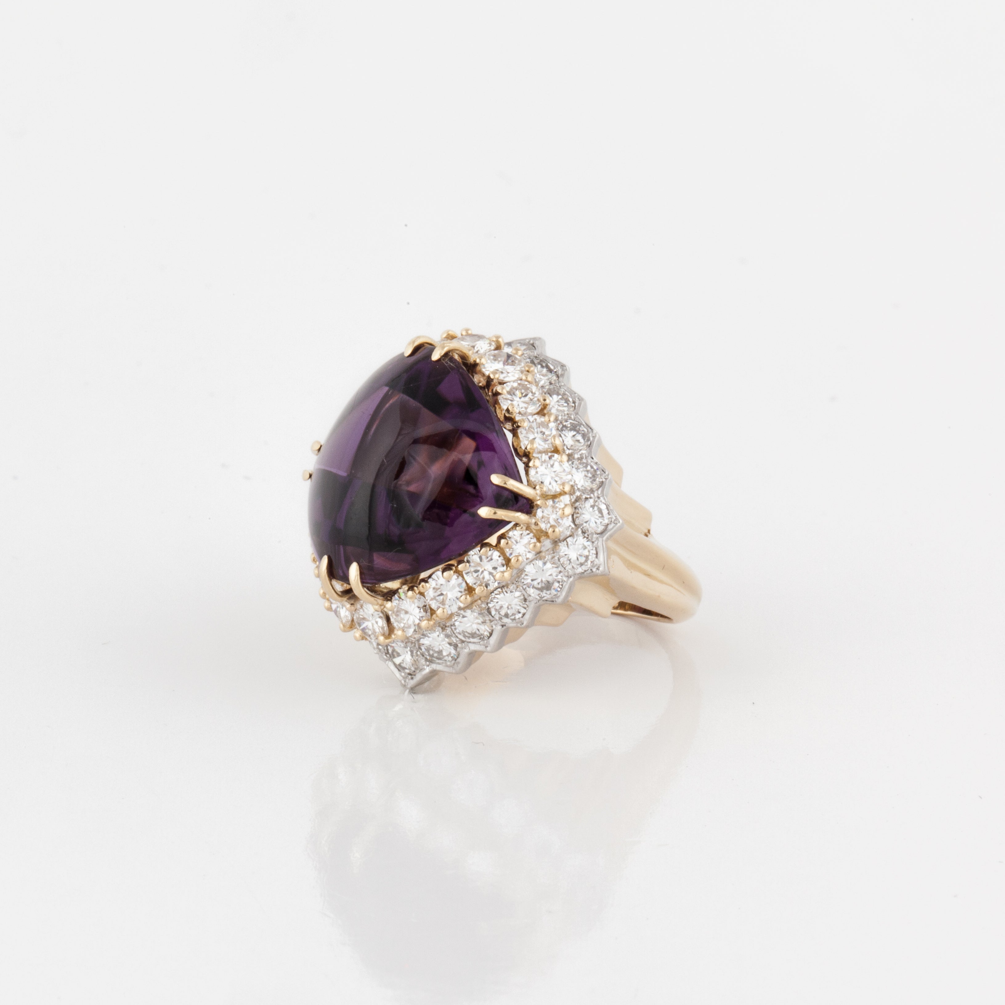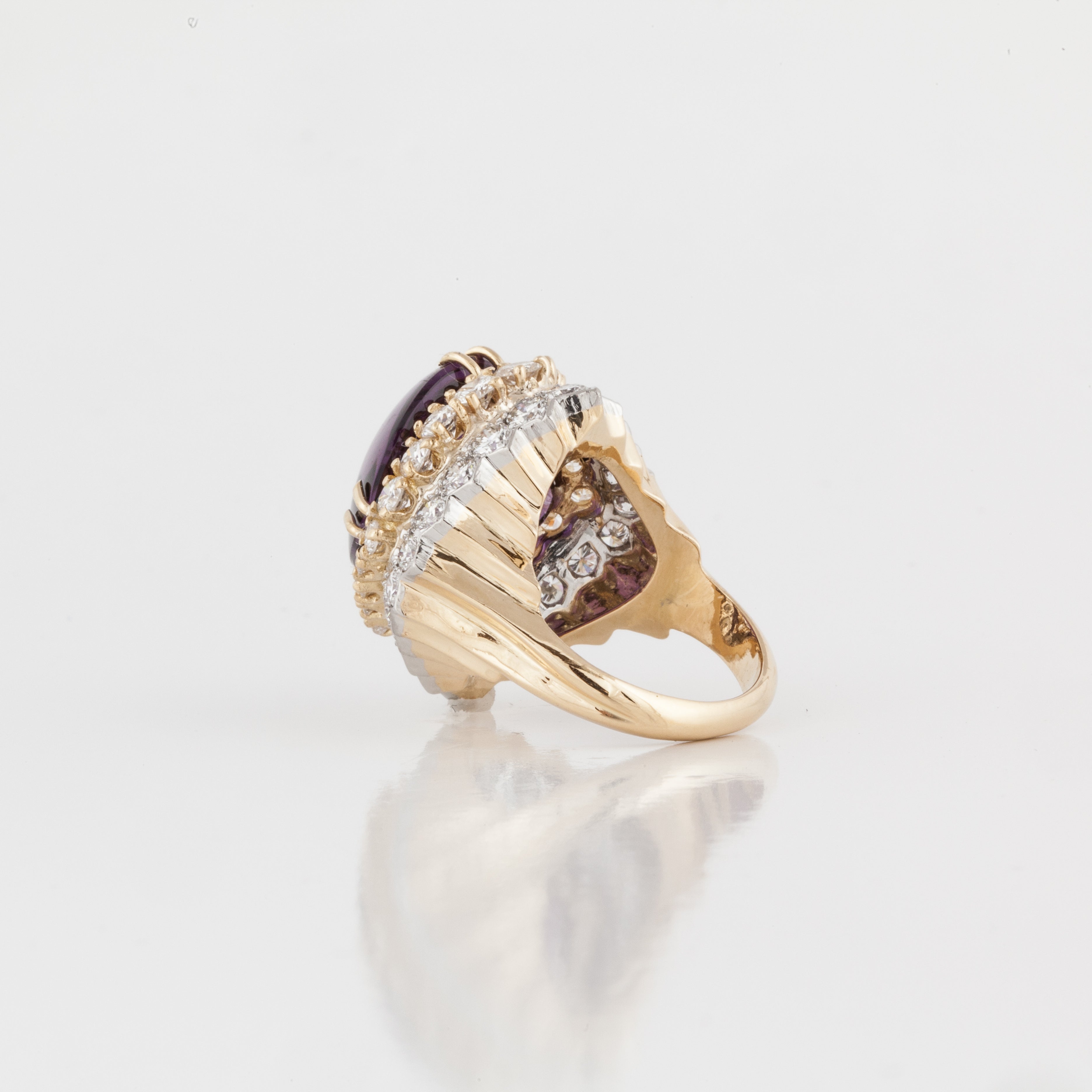 A vintage cabochon amethyst ring with a double round-cut diamond border, set in 18K yellow gold. Circa 1970.