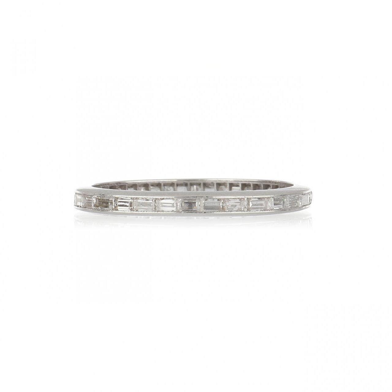 A vintage channel-set eternity band with baguette-cut diamonds, set in platinum. Circa 1970.